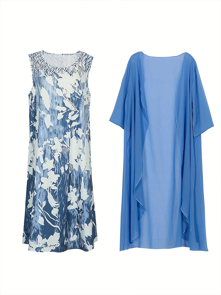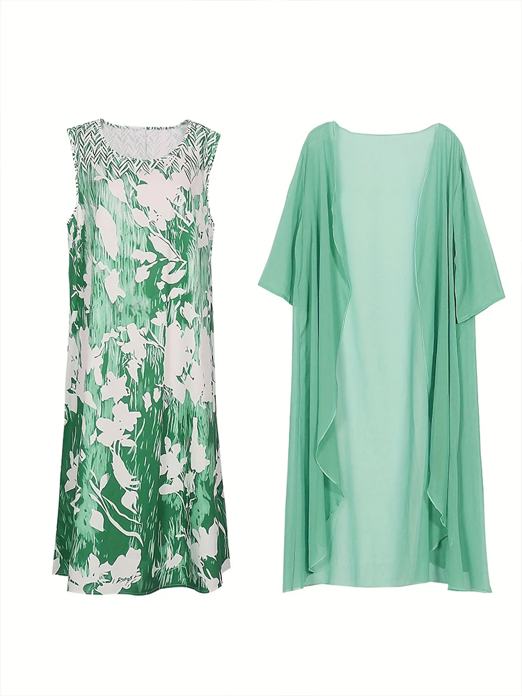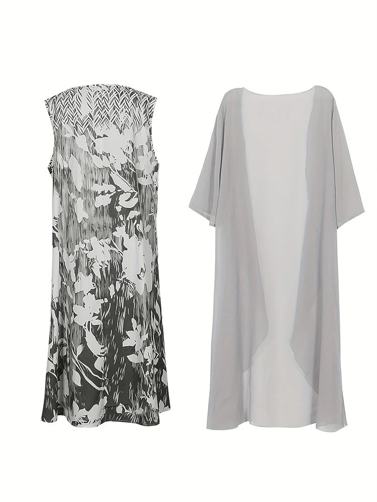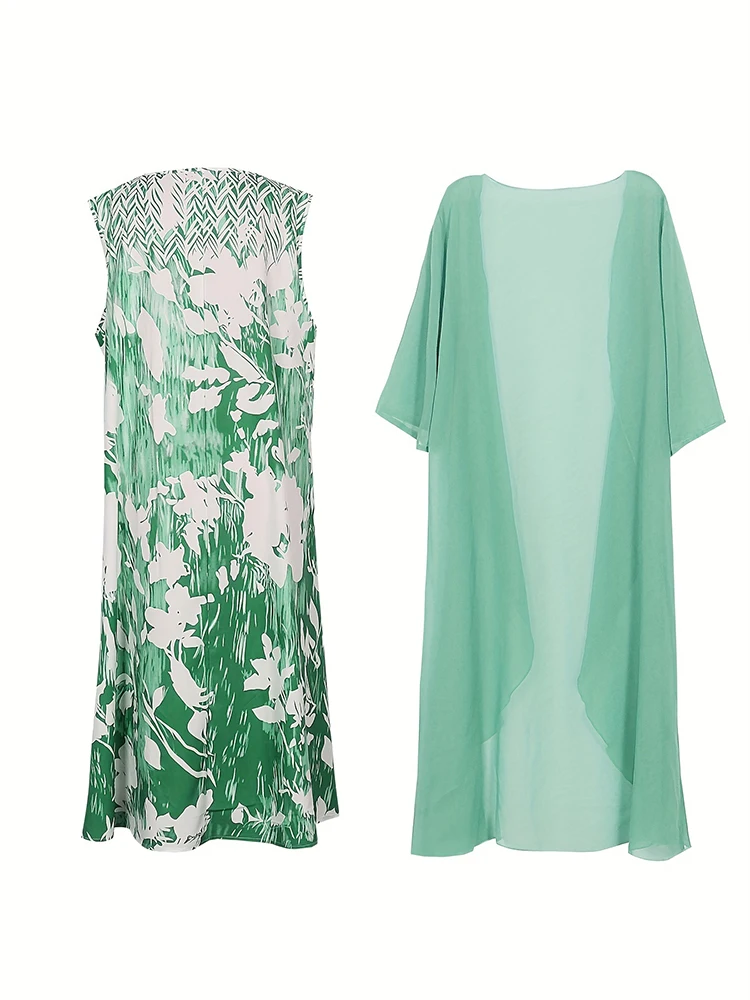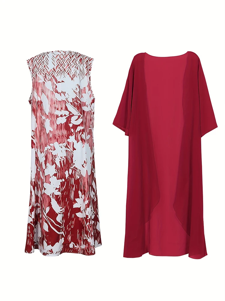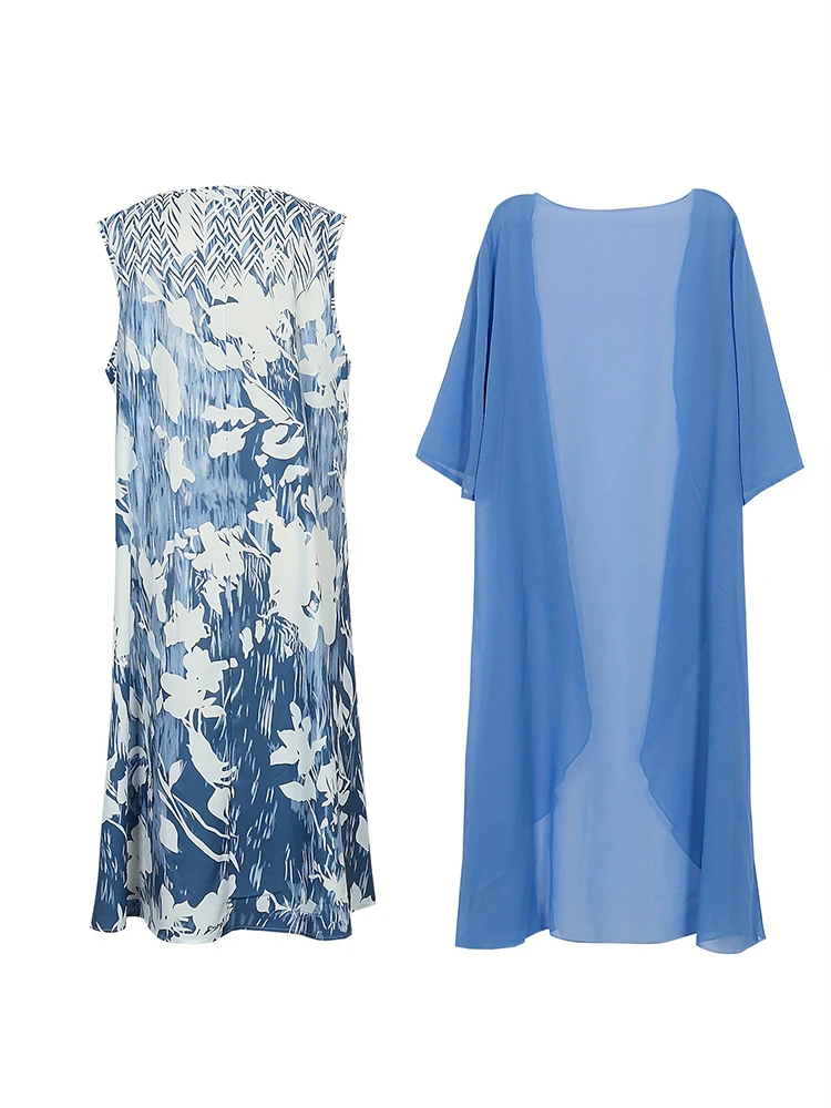 This plus-size bohemian set includes a knee-length dress and a sheer open topper, designed for effortless elegance and breathable comfort. The dress features a fit and flare silhouette with a loose fit, O-neckline, and half sleeves, making it both flattering and easy to wear. Crafted from lightweight polyester, the outfit is perfect for warmer days. The printed pattern adds a touch of artistry, while the natural waistline offers relaxed structure. Ideal for casual gatherings or vacation wear, this set blends style and ease.