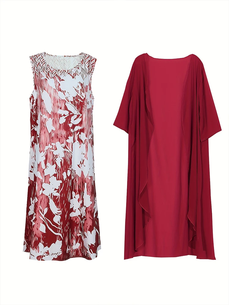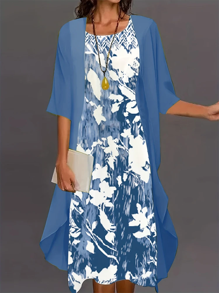 Plus Size Women's Floral Printed Long Dress Printed Pattern Two-piece Dress Round Neck Elegant Dress