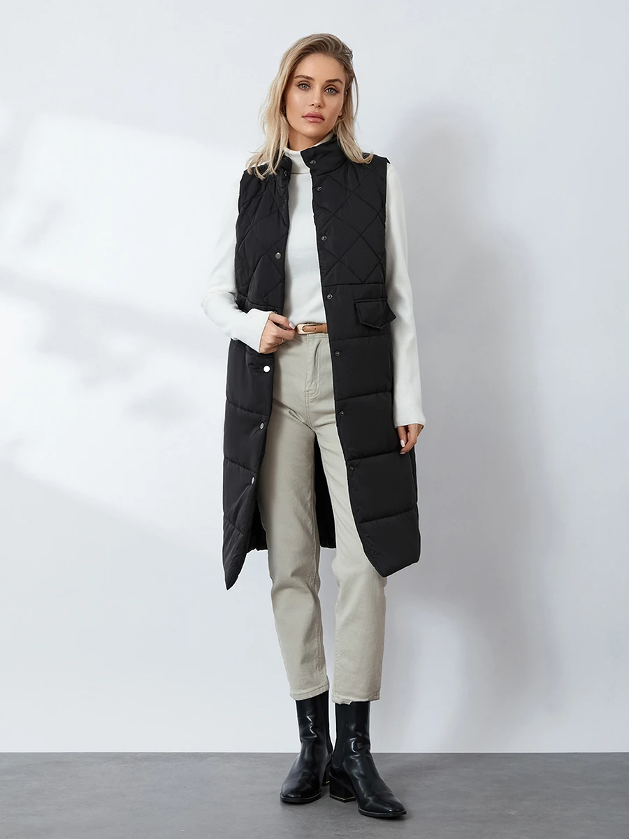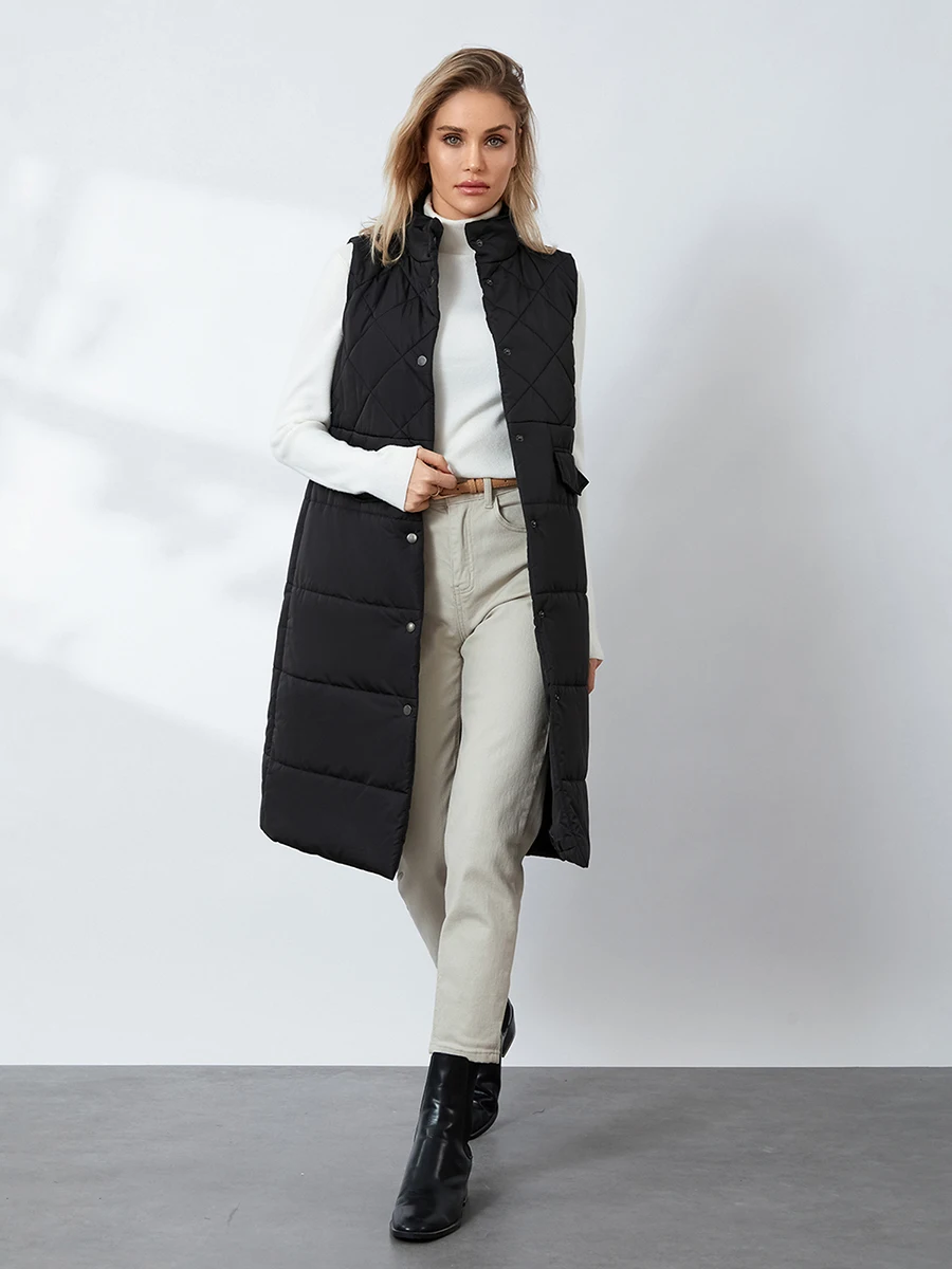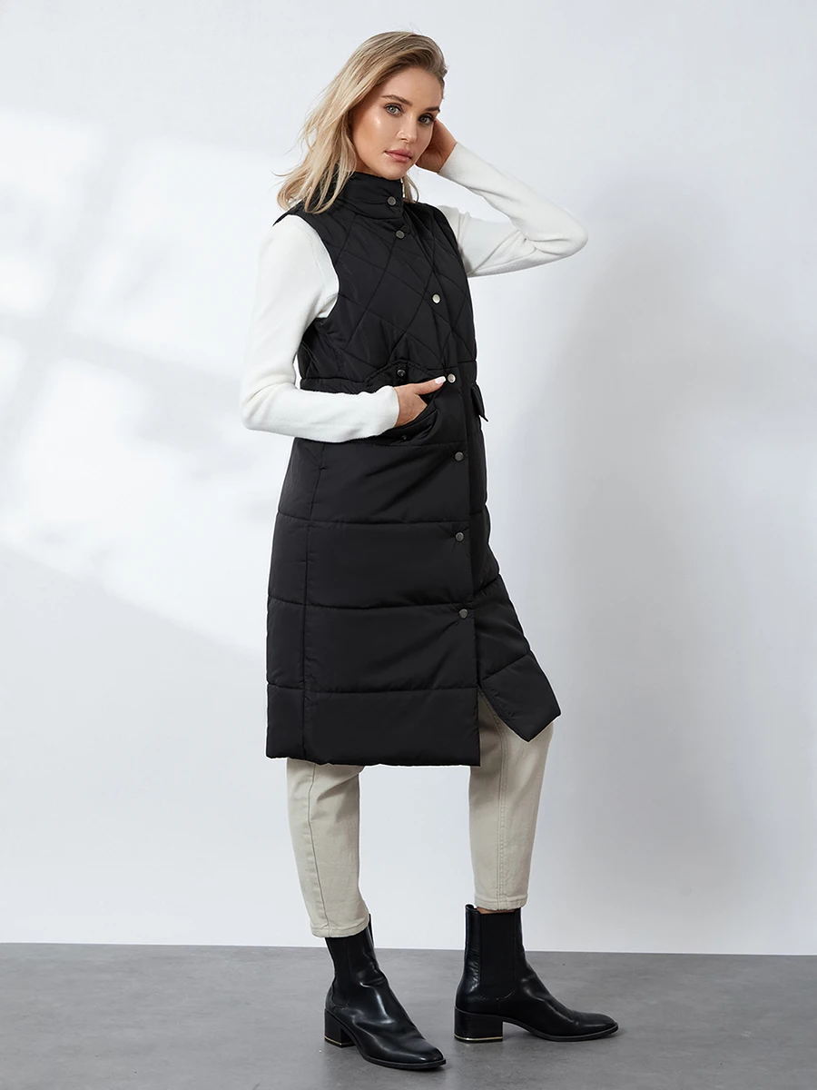 Solid color quilted design, stand collar, modern design, 2 pockets, front button closure, sleeveless, mid-length, women's puffer vest, quilted puffer jacket is not only warm but also lightweight, stylish and comfortable.