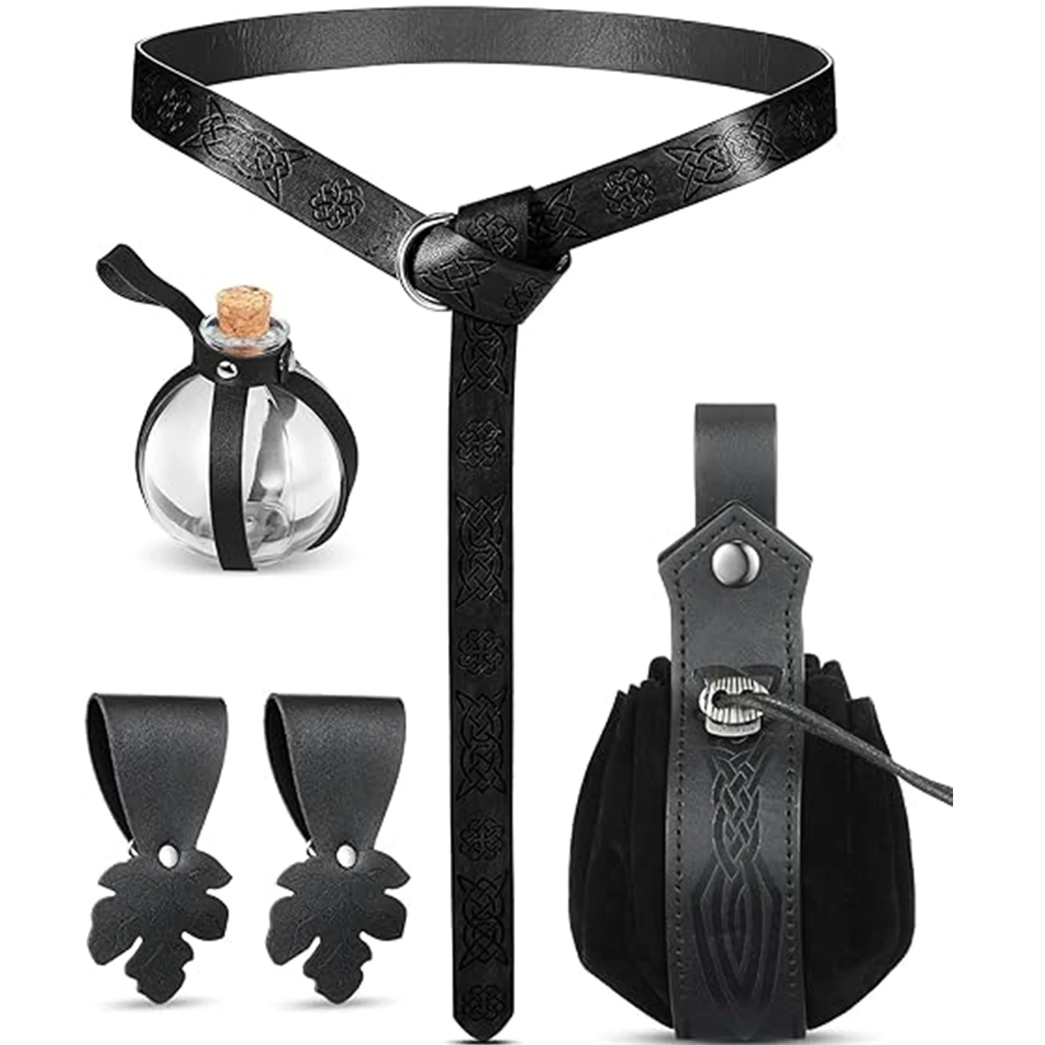 Step into a world of adventure with this 3.4cm wide Renaissance-inspired belt set, featuring a 6-pack of medieval pirate-style belts. Made from durable PU leather, each belt includes a functional cork potion bottle and bag design, perfect for completing a pirate, medieval, or fantasy-themed outfit. Ideal for costume enthusiasts or those looking to add a unique, vintage touch to their wardrobe.