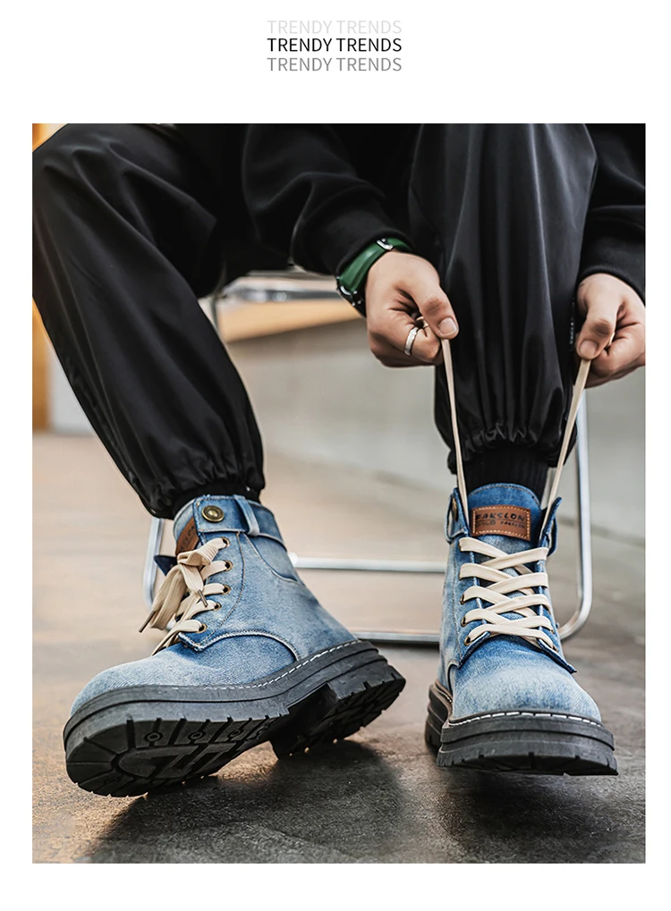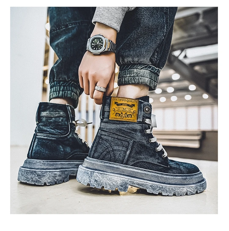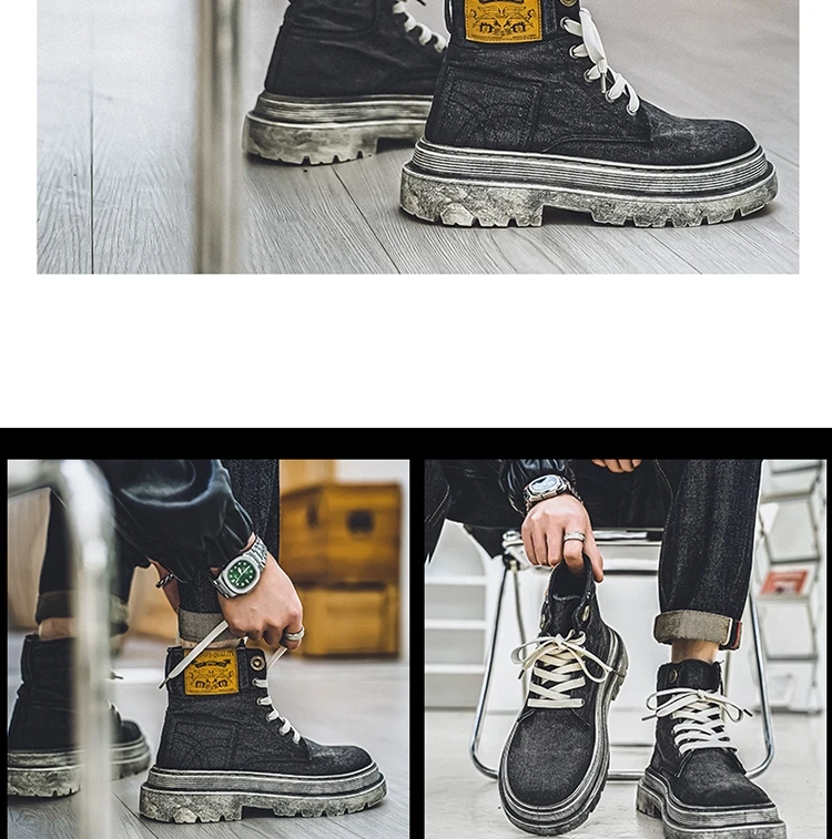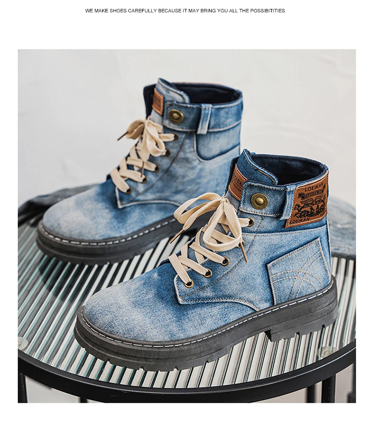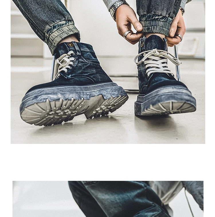 Retro Blue Denim Boots Men Lace-up Platform Men's Tooling Boots Western Basic Boots Men High Top Working Shoe Men Outdoor Boots