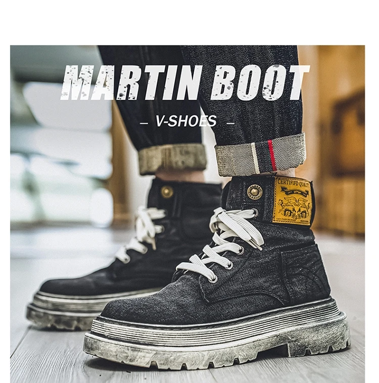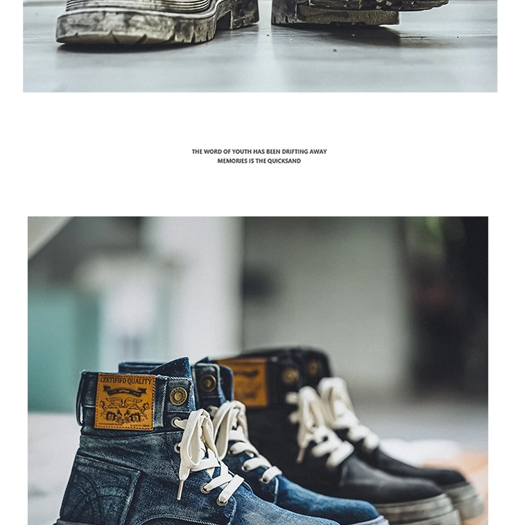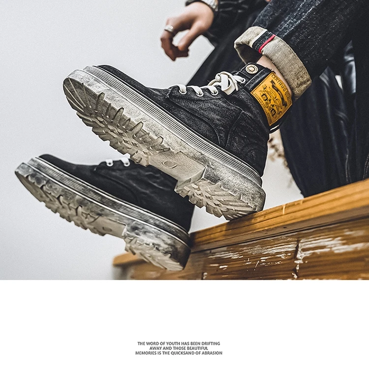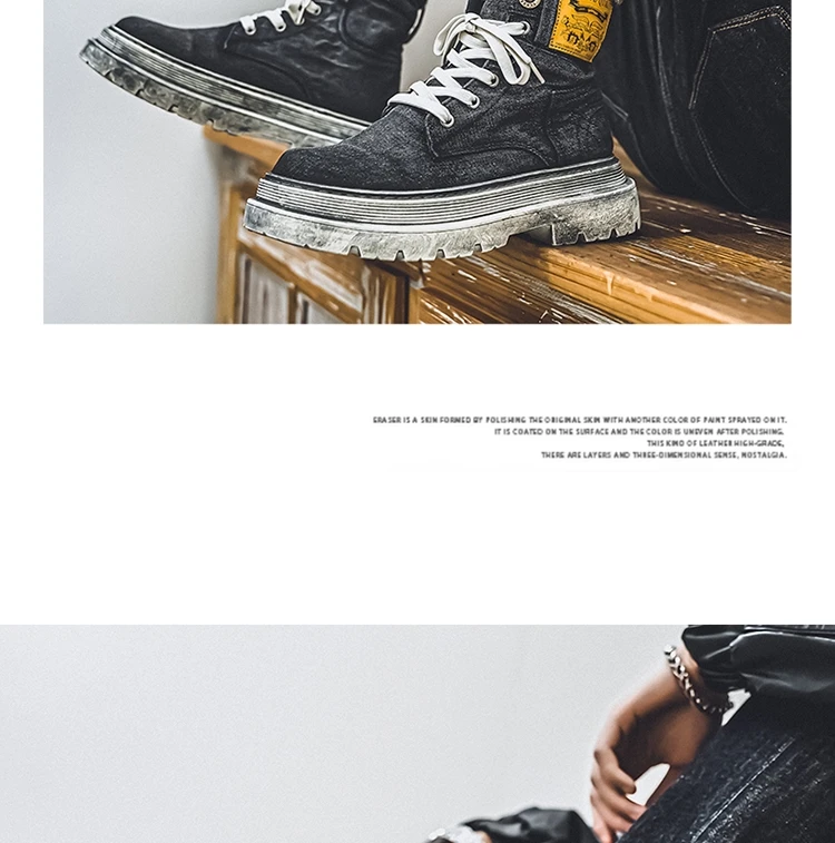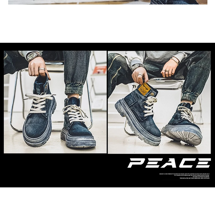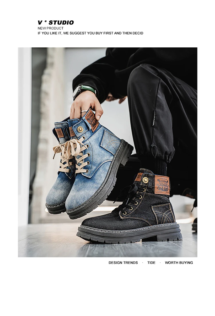 Retro Blue Denim Boots Men Lace-up Platform Men's Tooling Boots Western Basic Boots Men High Top Working Shoe Men Outdoor Boots