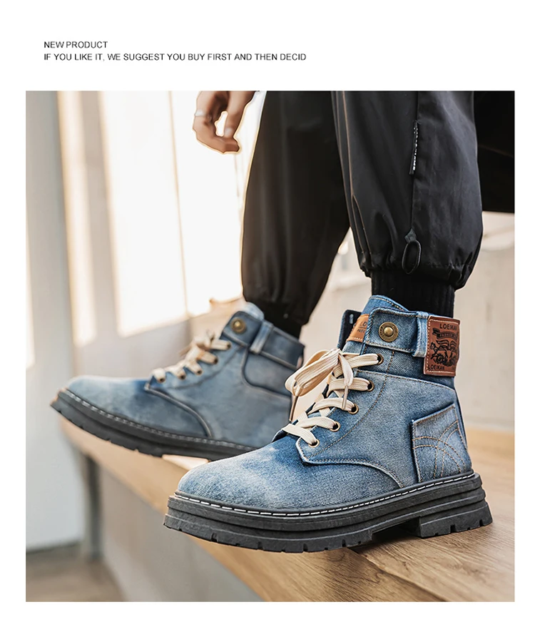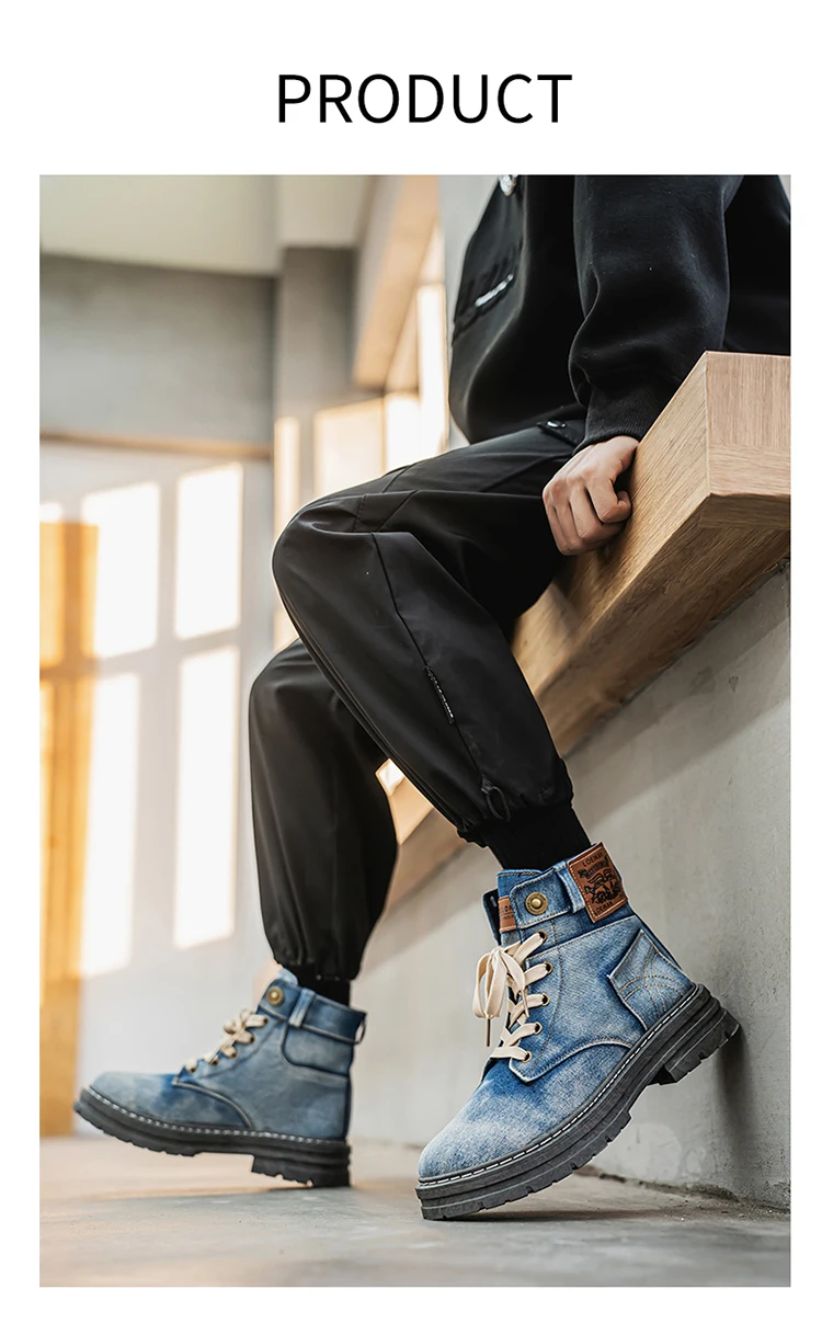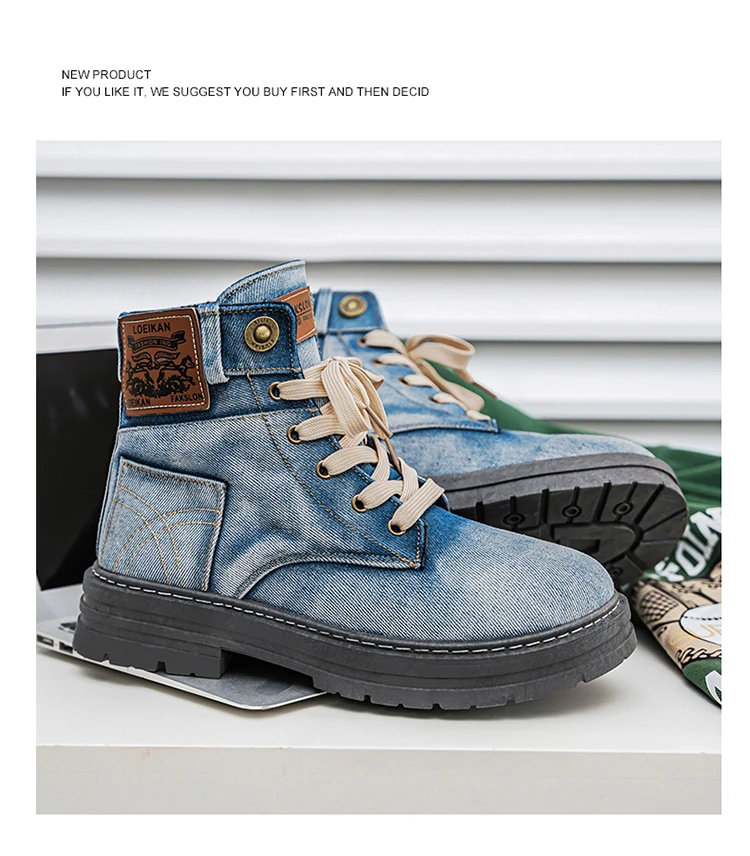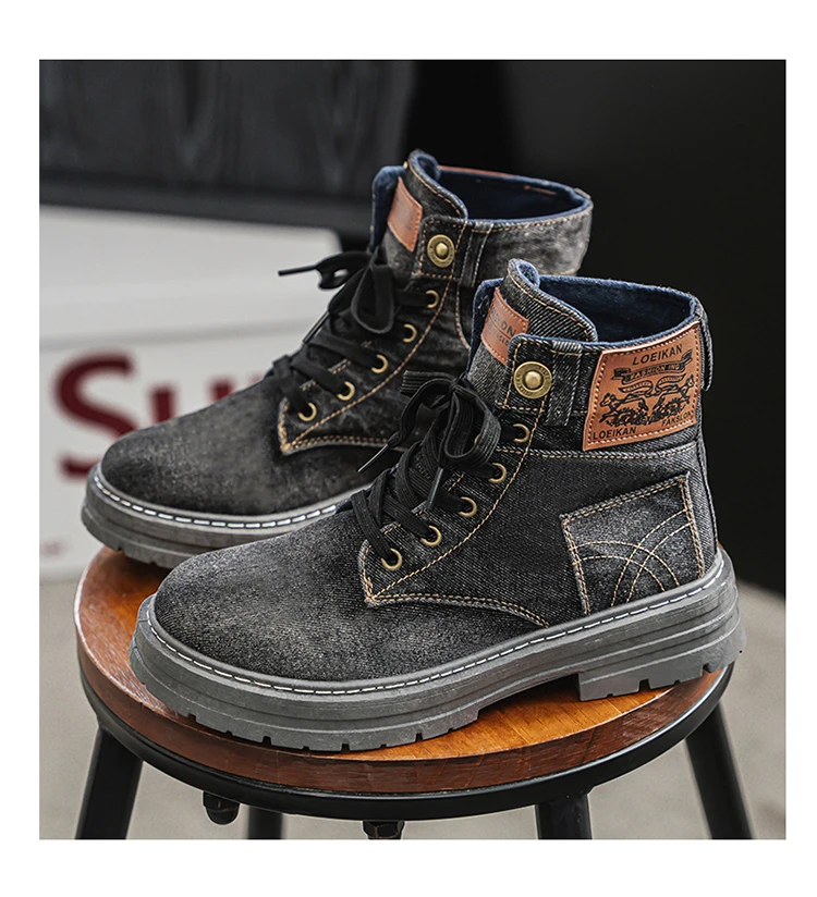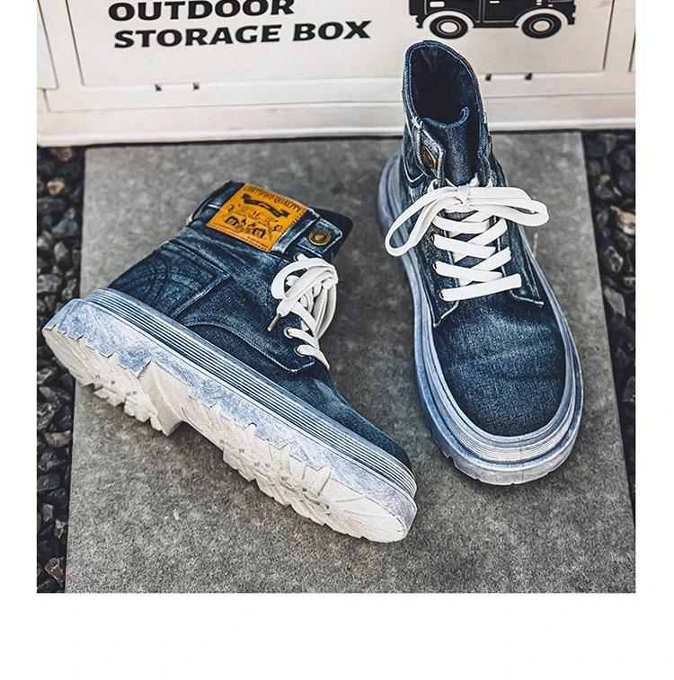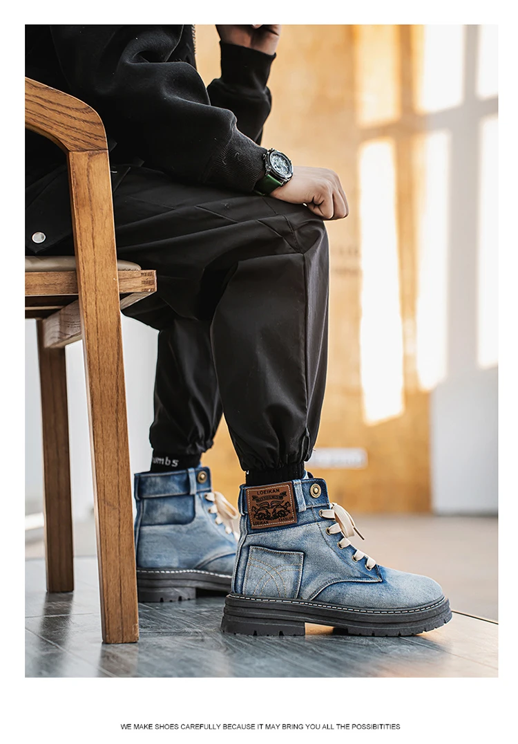 Step into rugged retro style with the MEOD Retro Blue Denim Boots for Men, combining the toughness of a tooling boot with the bold look of high-top streetwear. Made from durable denim with detailed sewing accents, these lace-up platform boots feature a sturdy build and medium heel height (3cm–5cm) for added lift and support. The breathable canvas lining, cushioned EVA insole, and high-traction outsole ensure comfort and durability for outdoor work or casual wear. With above-the-ankle coverage, a solid pattern, and retro western vibes, these boots are the perfect blend of function and fashion.