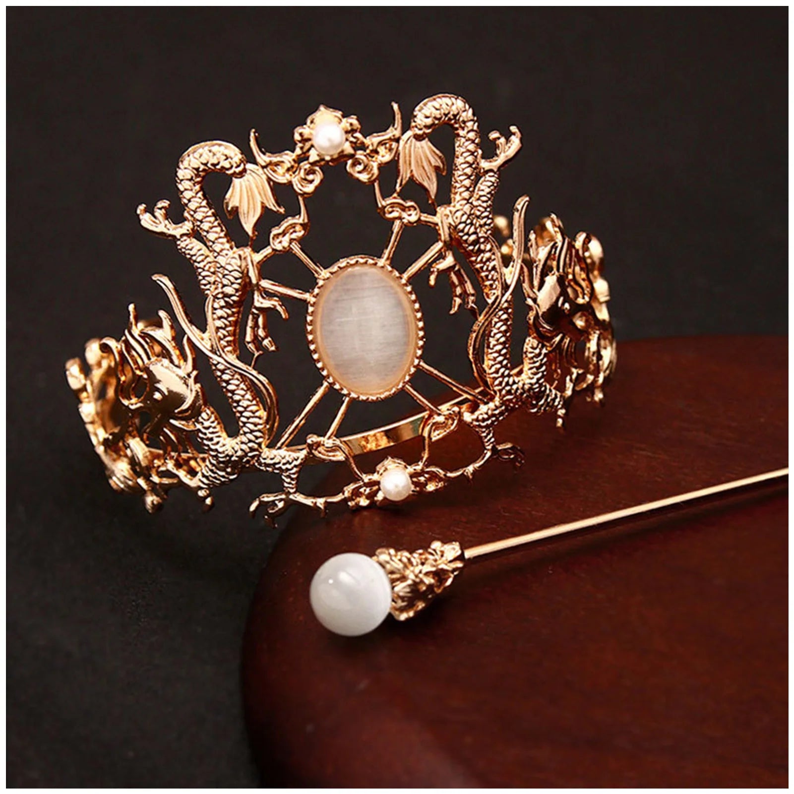 Retro Chinese Hair Crown Golden Alloy Tiaras and Crowns Pearl Headbands with Hair Sticks Vintage Hair Jewelry for Men Women