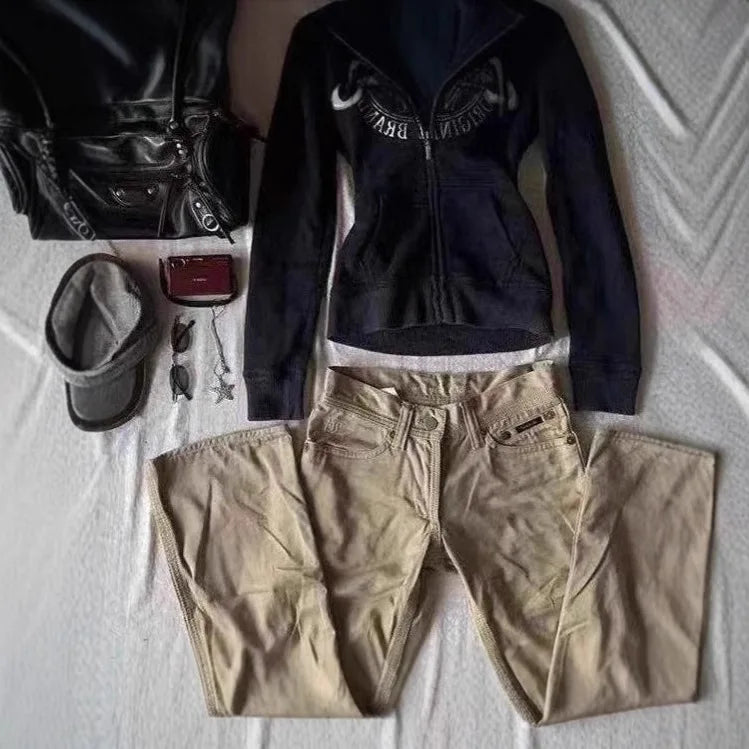 Retro Jacket Retro Design Black Hoodie Women's Casual Hoodie Multifunctional Sweatshirt