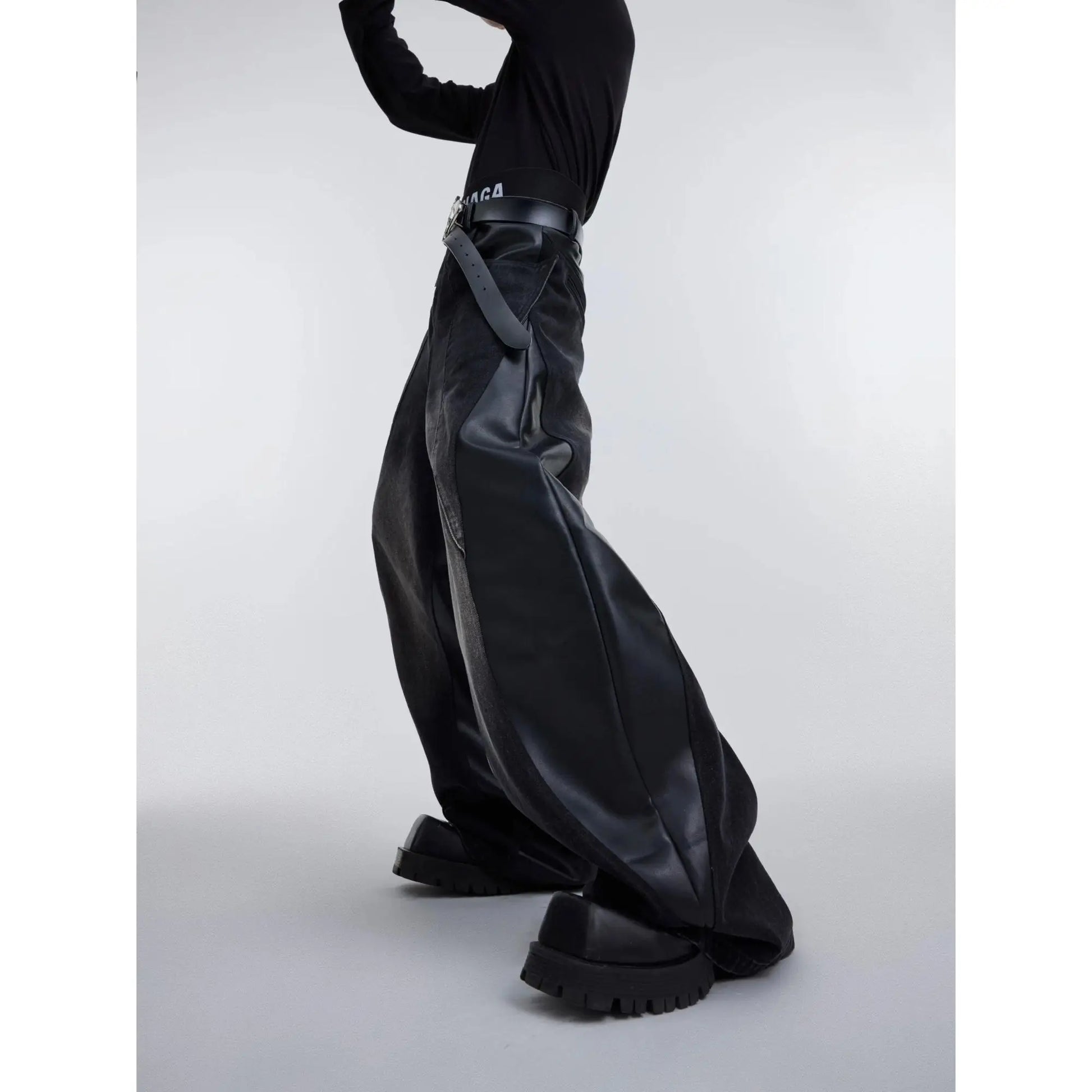 Y2k Retro Washed Splicing Jeans for Men New Hip Hop Punk PU Leather Baggy Jeans Straight Casual Black Denim Trousers Streetwear