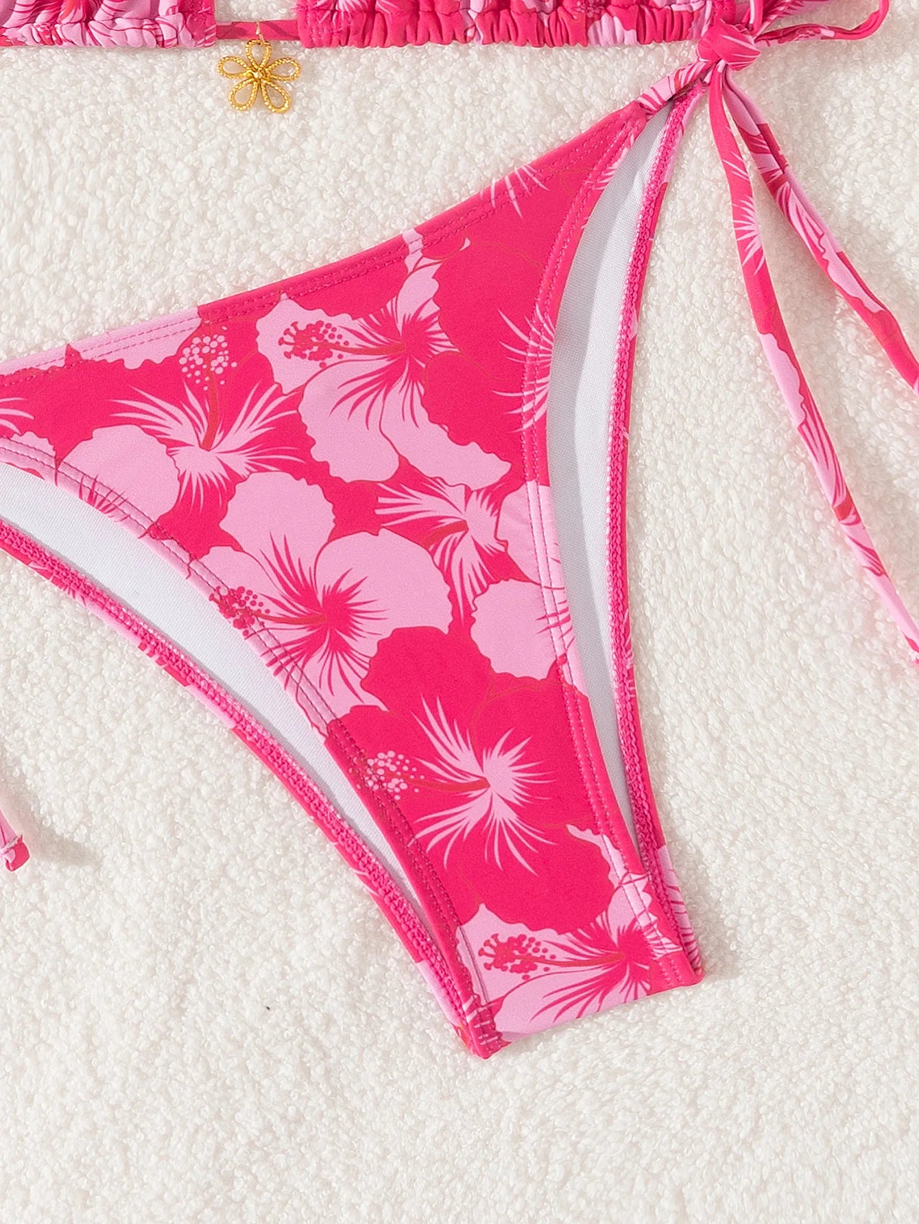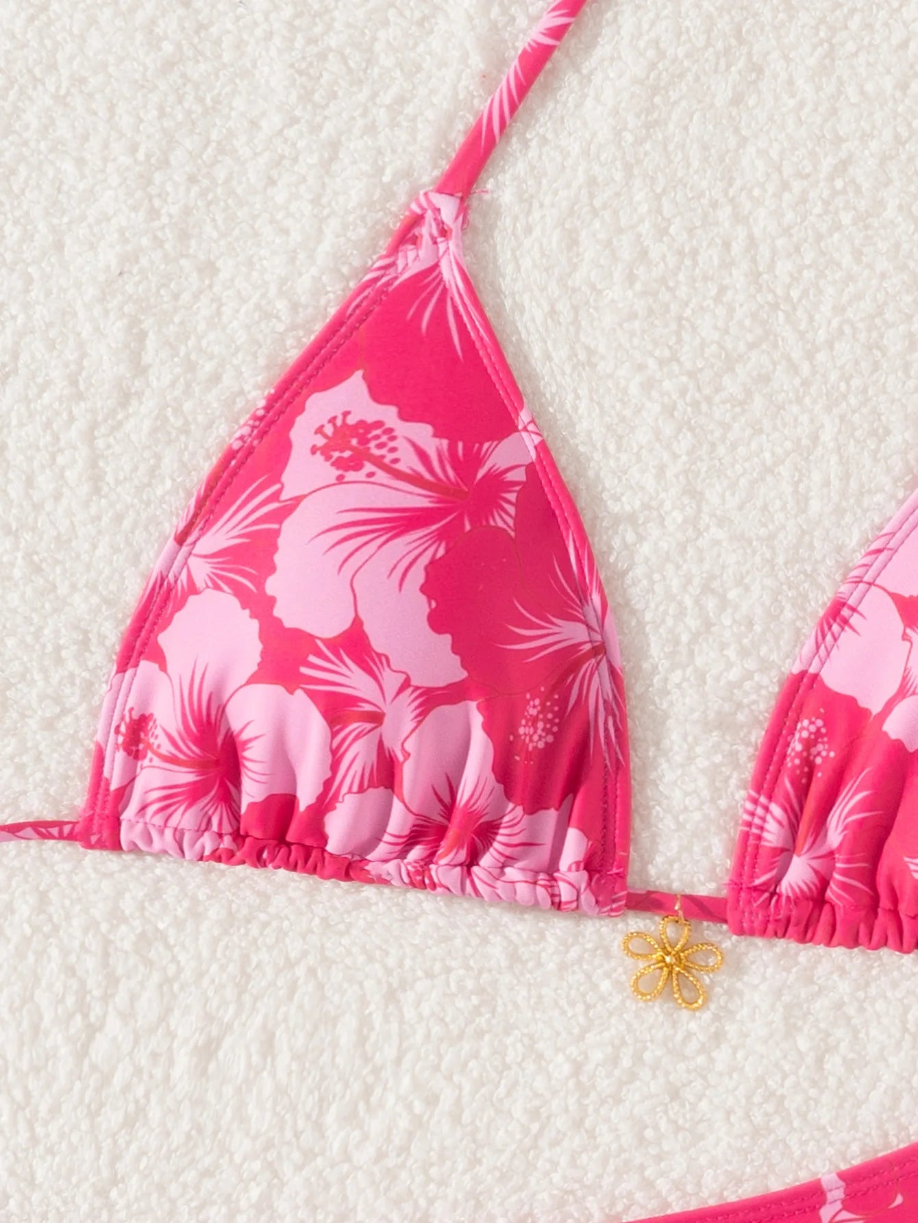 Rose Red Flower Print Bikini Set for Women Triangle Halter Backless Swimsuit Beach Vacation Thong Swimwear