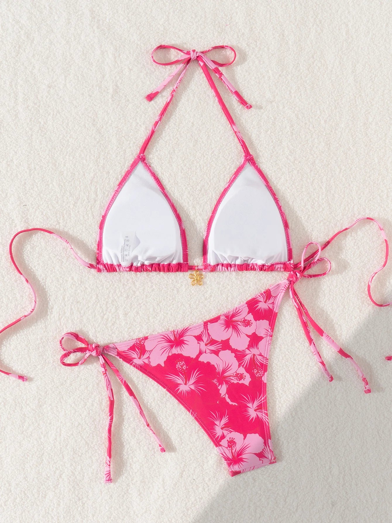 Rose Red Flower Print Bikini Set for Women 2025 New Triangle Halter Backless Swimsuit Suit Beach Vacation Thong Sexy Swimwear