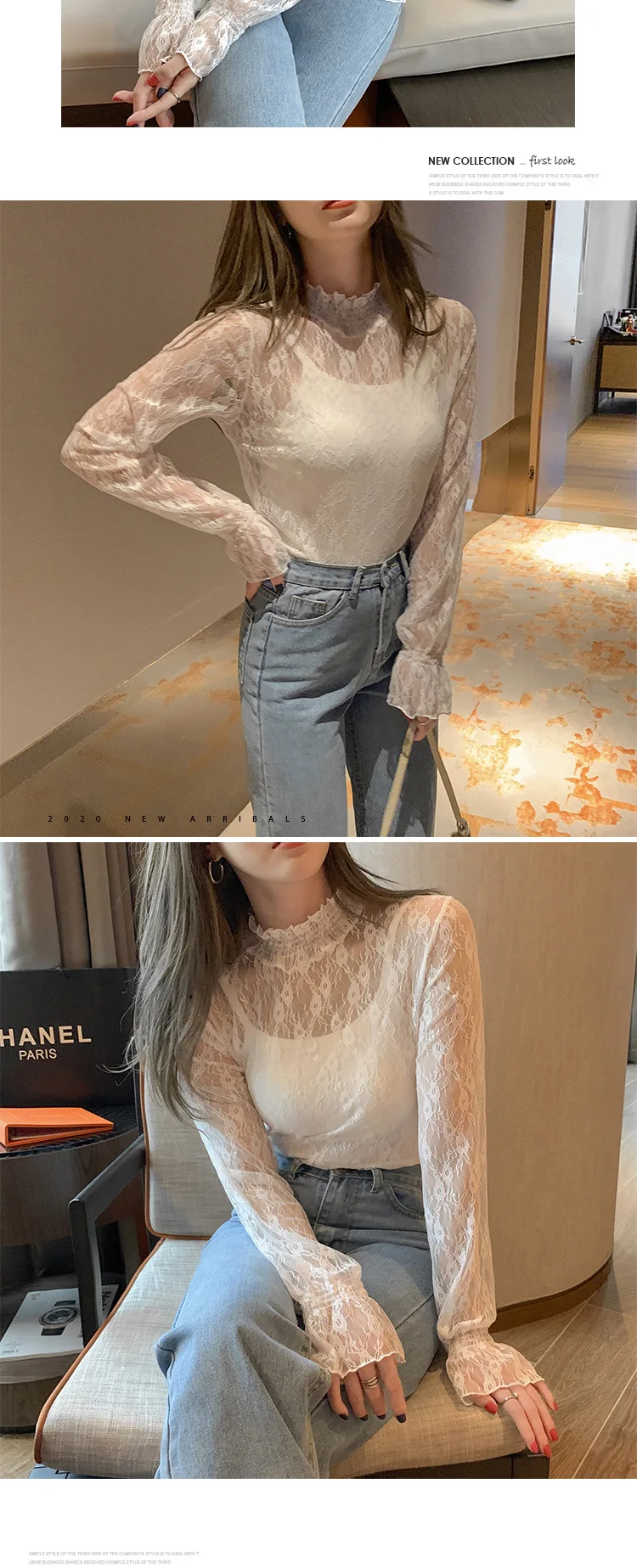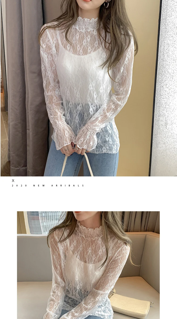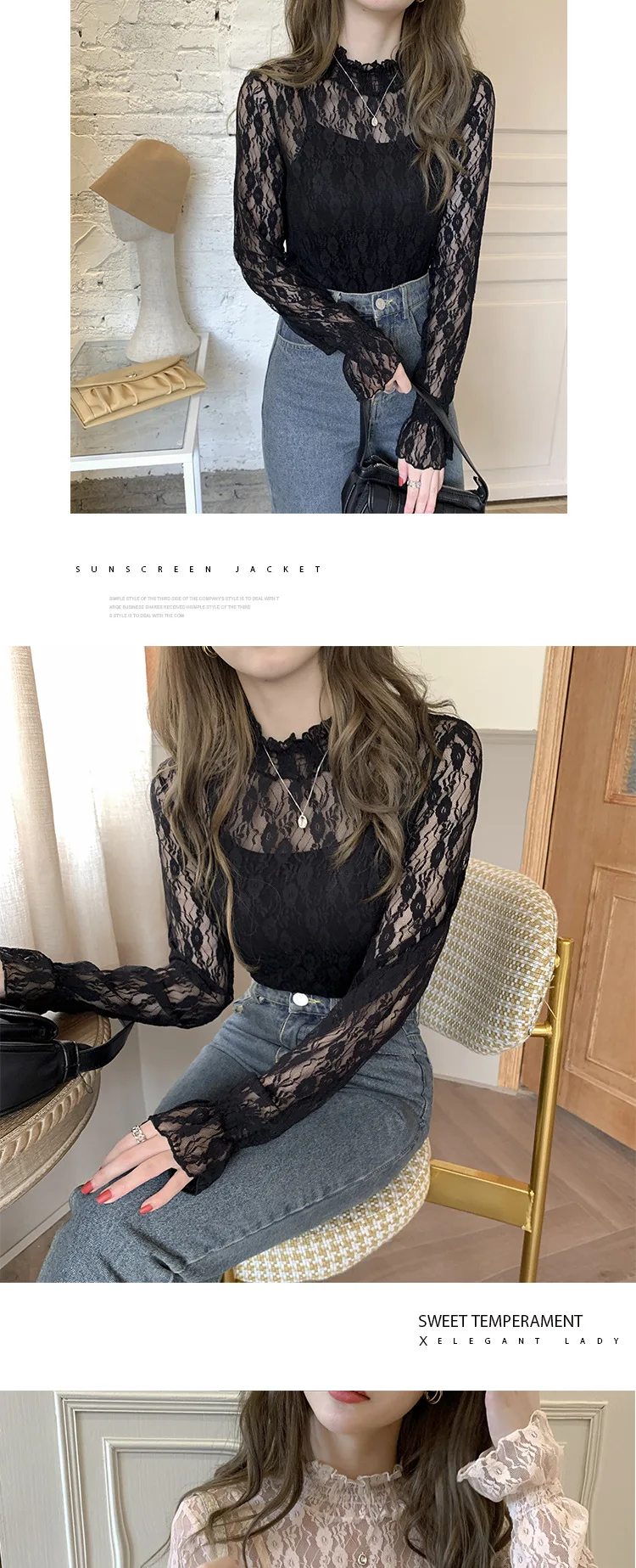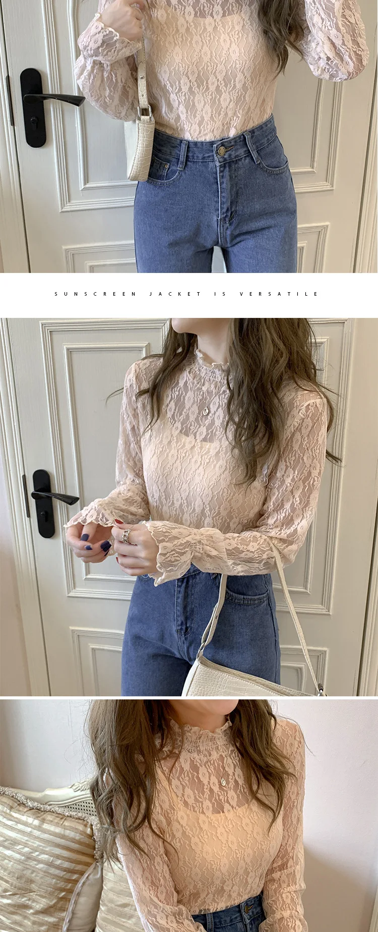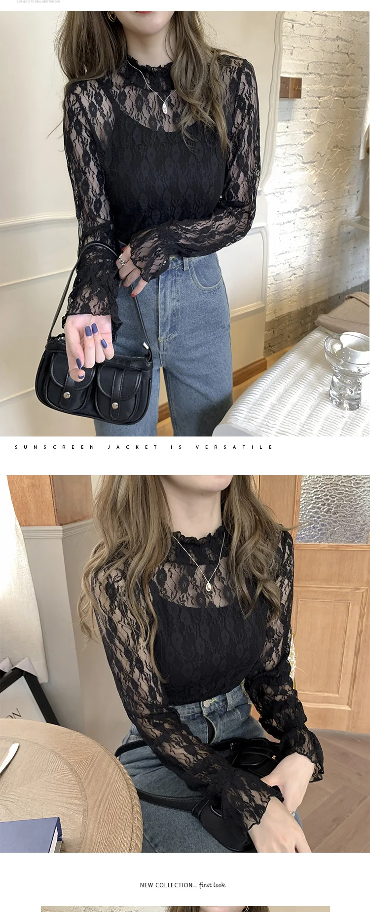 See Through Lace Flower Women's Blouse Long Sleeve Spring Summer Thin Crop Top