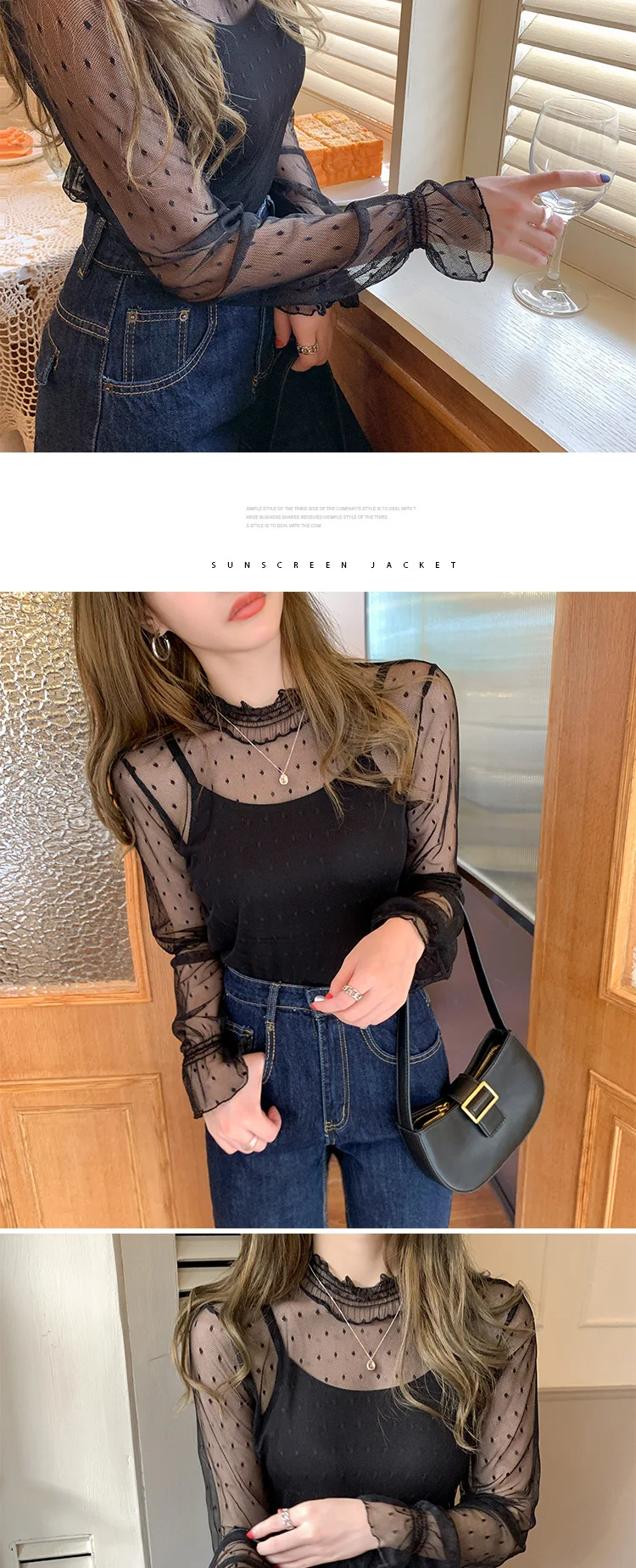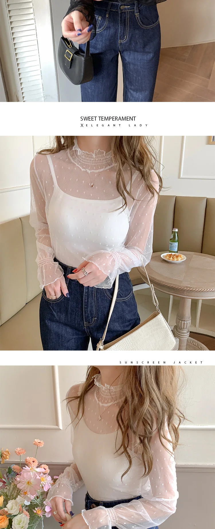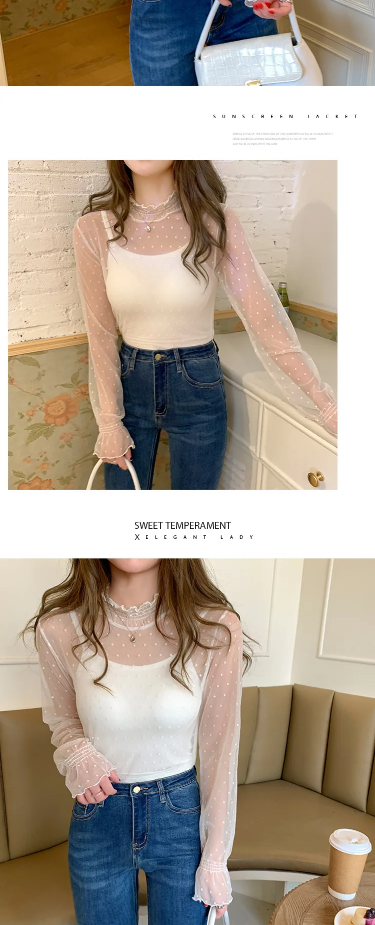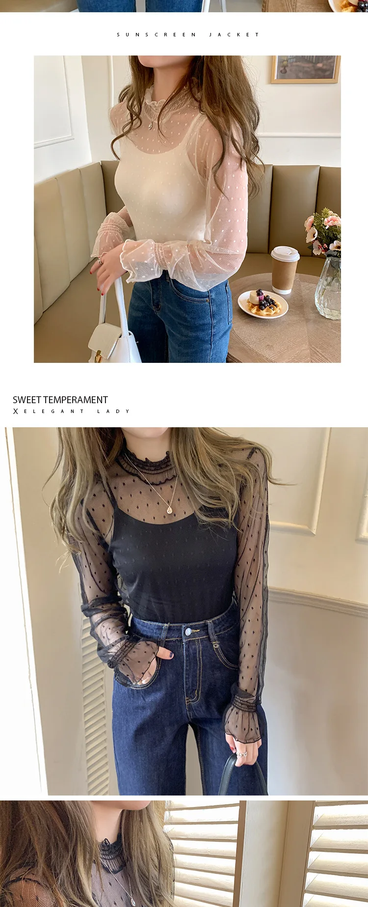 See Through Lace Flower Women's Blouse Long Sleeve Spring Summer Thin Crop Top