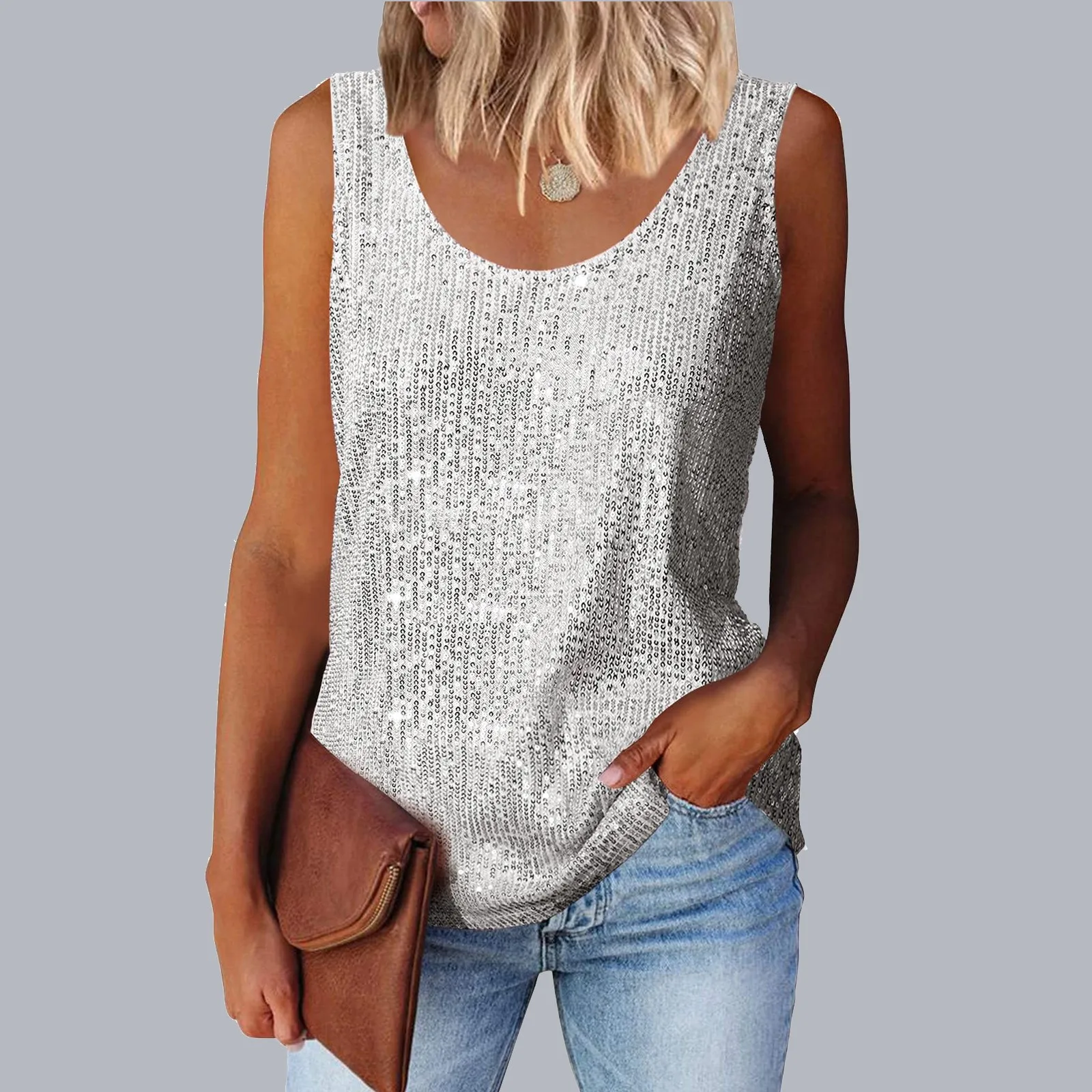 Womens Summer Fashion Sequin Tops Neck Sequin Sleeveless Tanks Tops Blouses