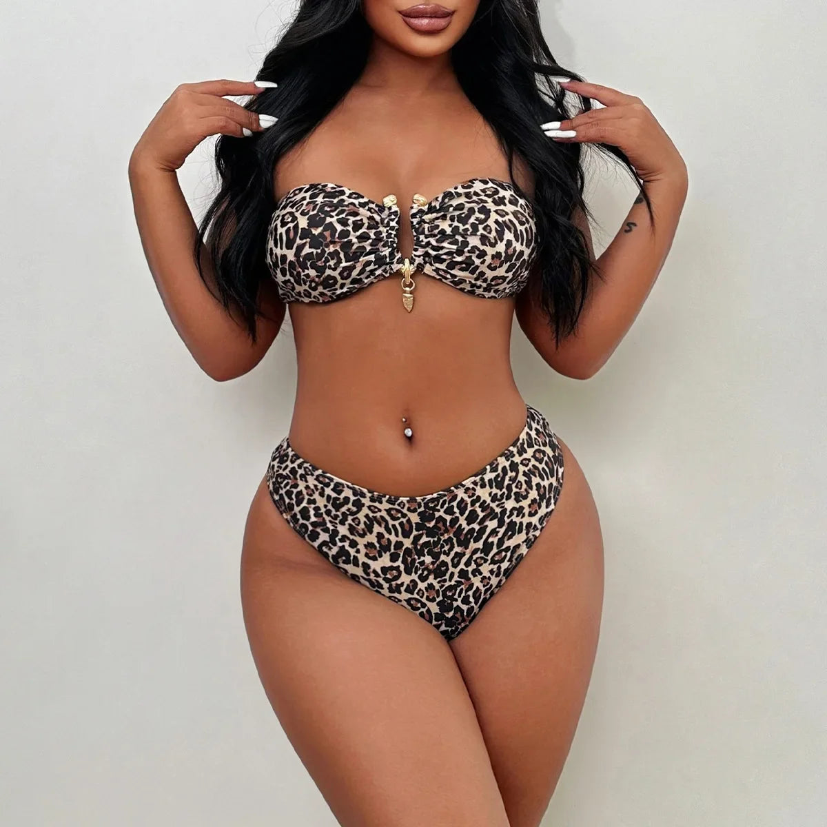 Sexy Leopard Print Two Piece Swimsuit for Women Strapless Backless Bikini Set