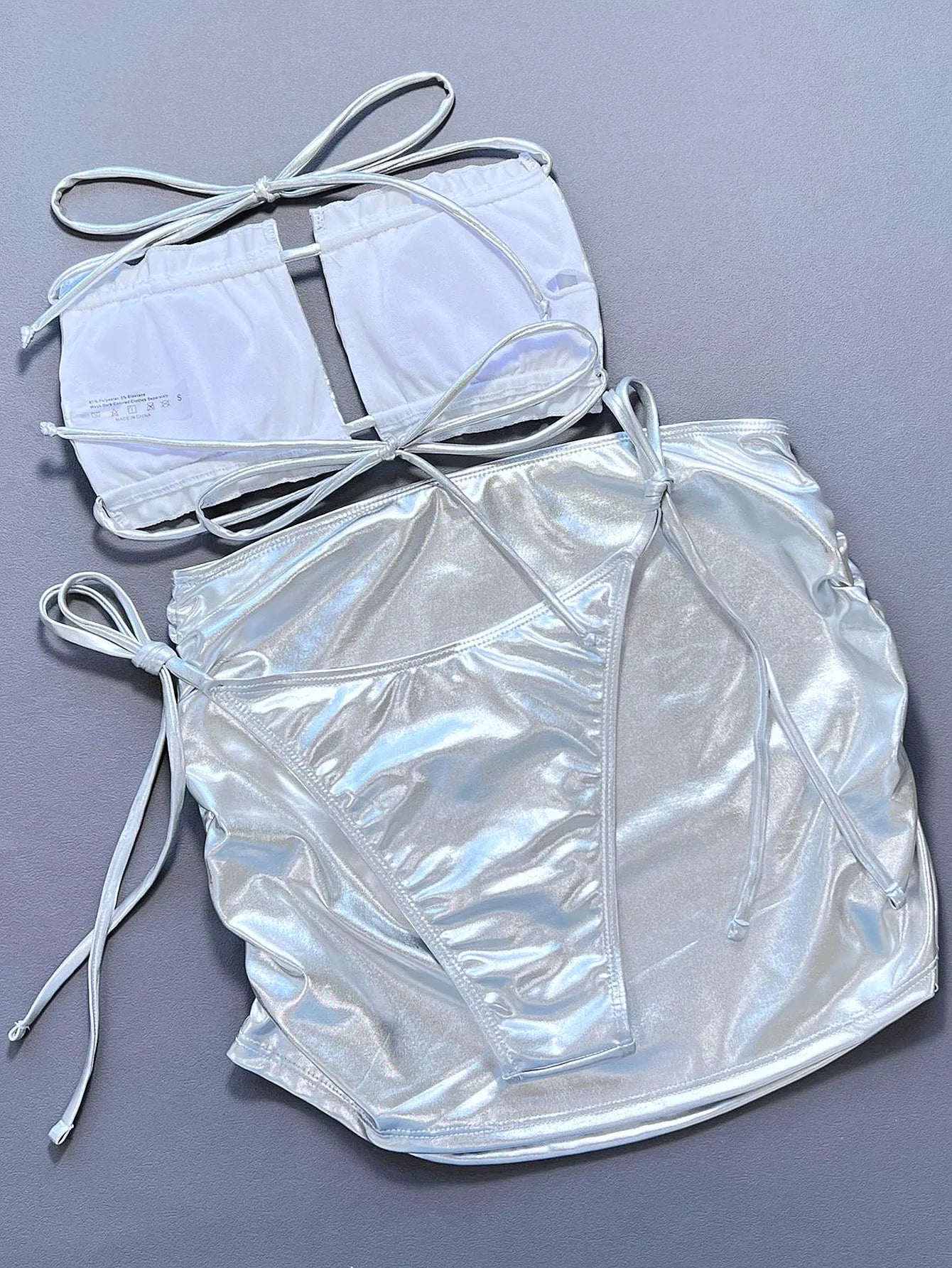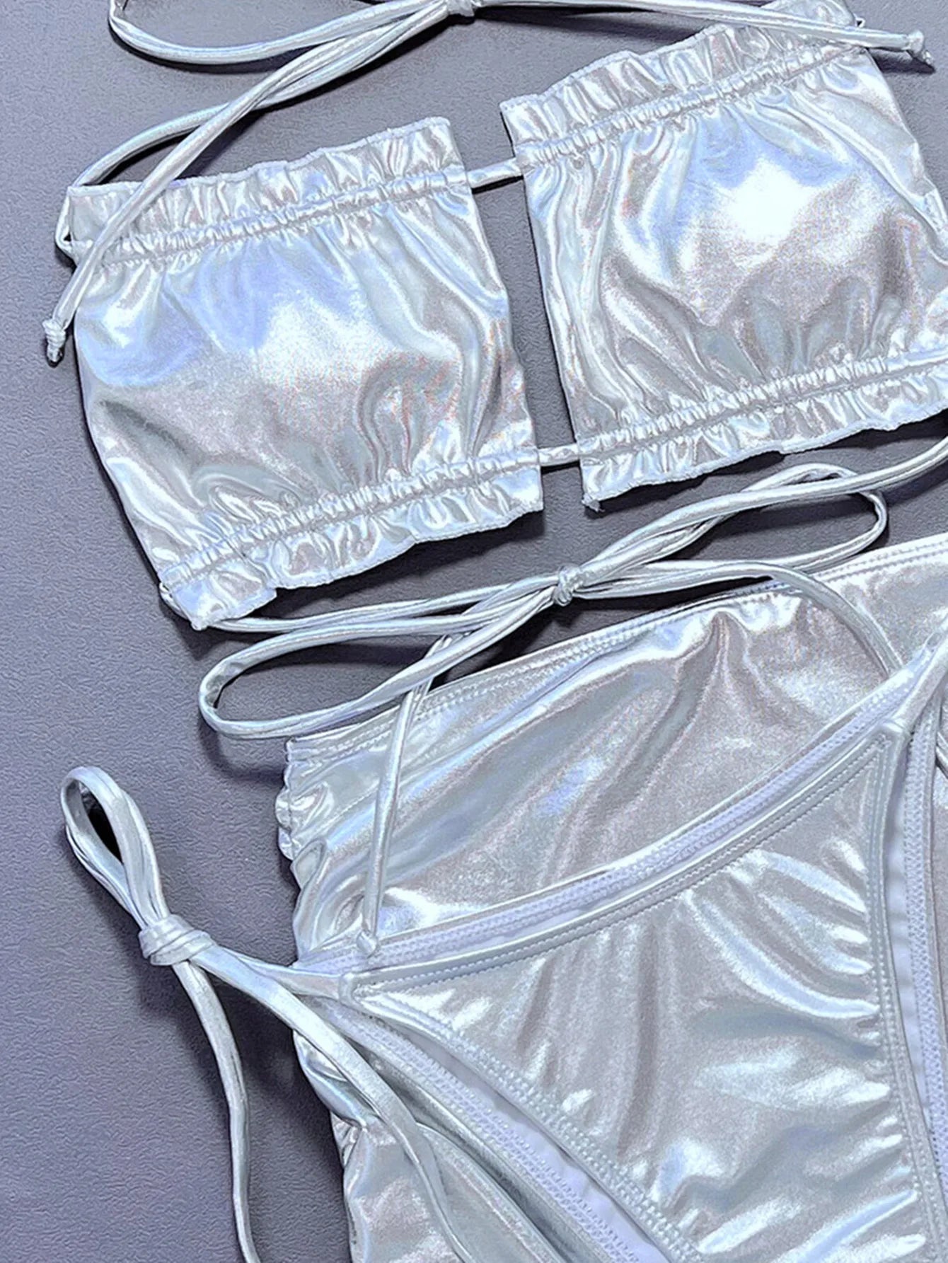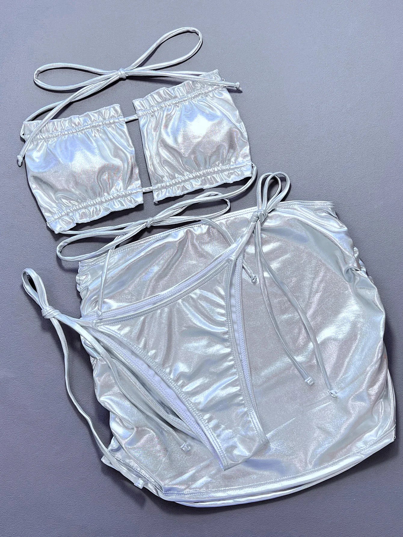 Silvery Shiny 3 Piece Swimsuit for Women High Waist Skirt Bikini Strapless Hollow Out Backless Ruffle Bathing Suit