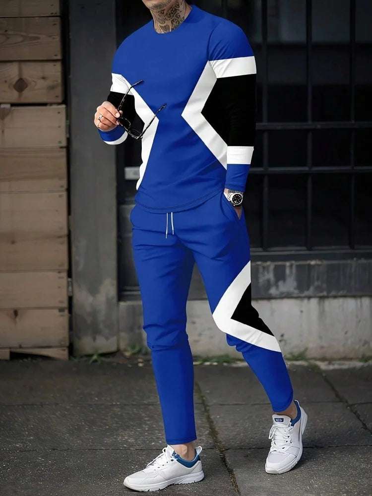 Simple Geometric Print Men's Fall Fashion Casual Crew-neck Tops And Pants Urban Street Fashion Trends Men's Tops And Long Styles