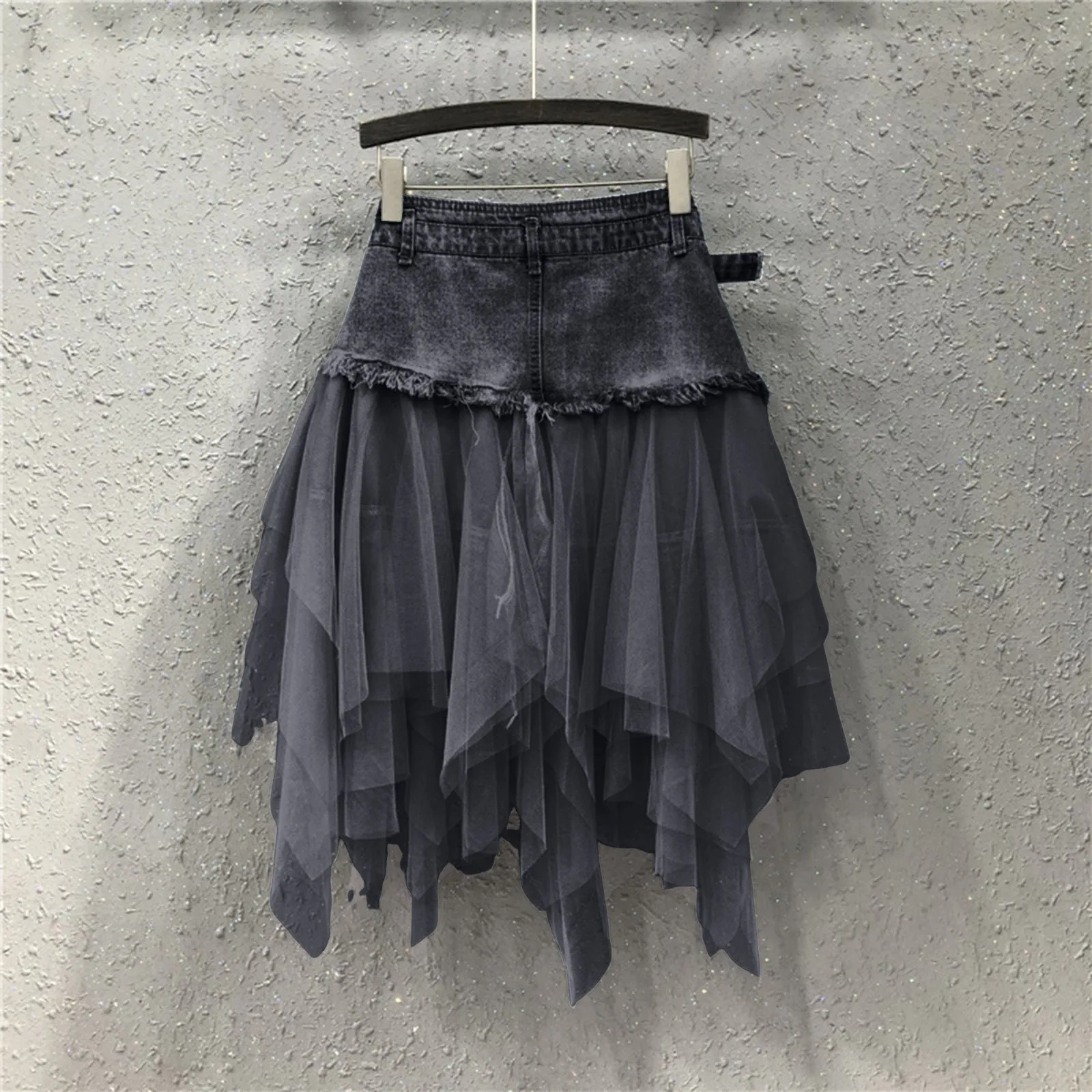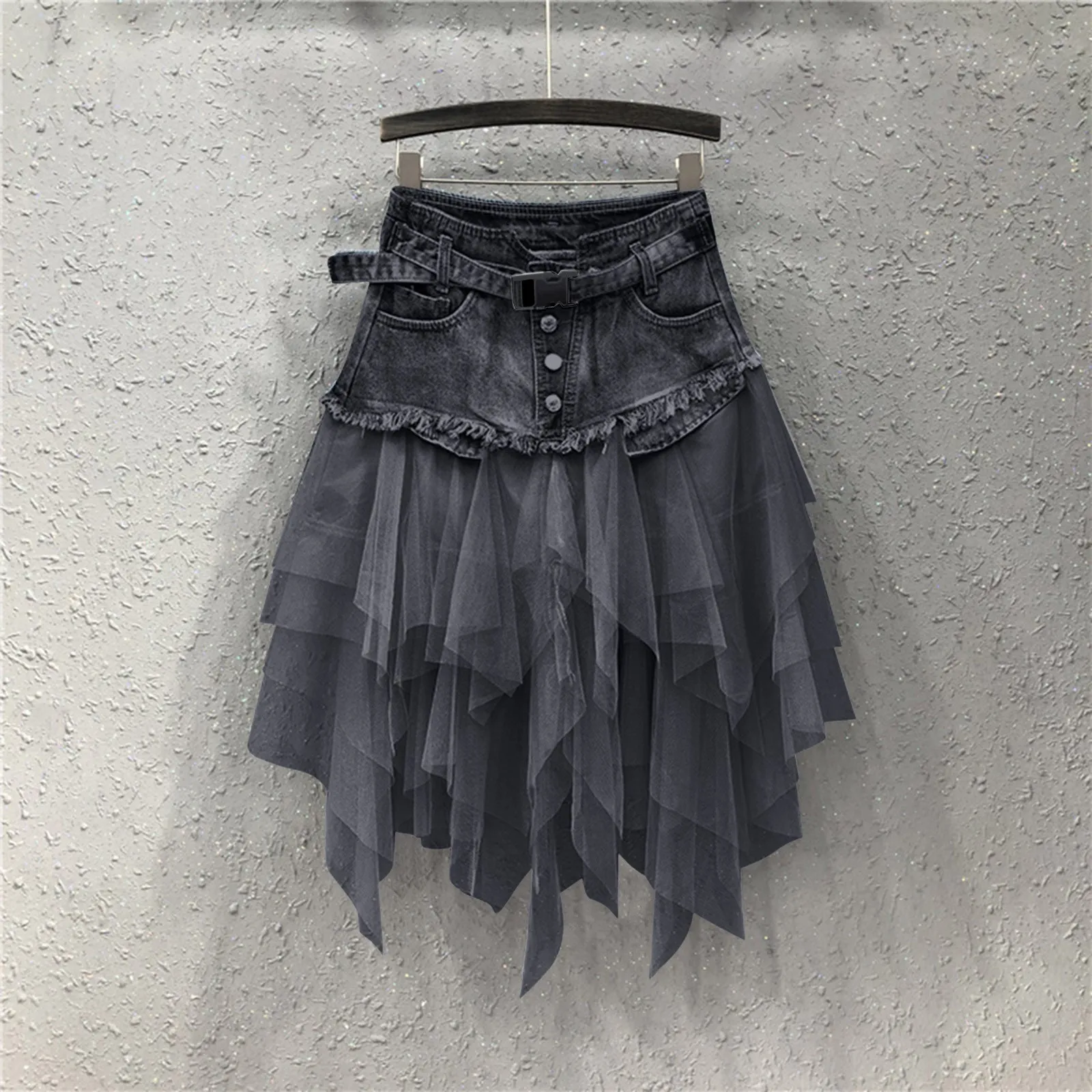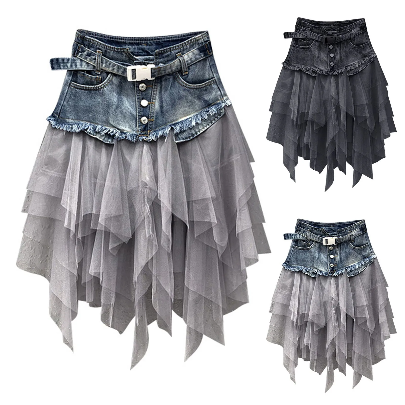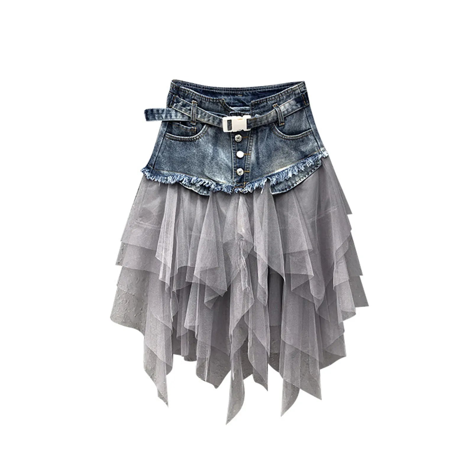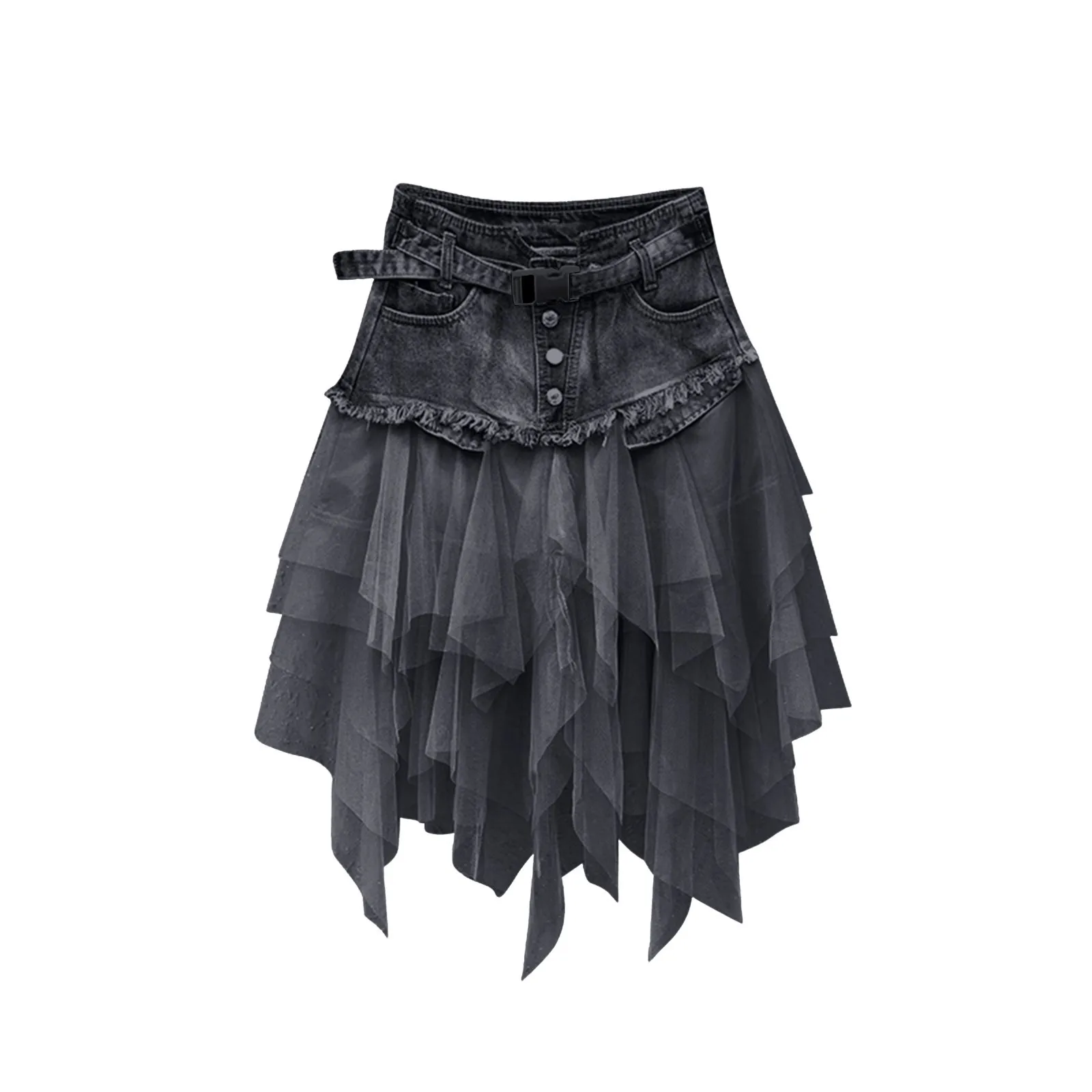 Skirt Women Aesthetic High Waist Denim Tulle Skirt Irregular Hem Belted Button Down Raw Edge A-Line Pleated Skirt