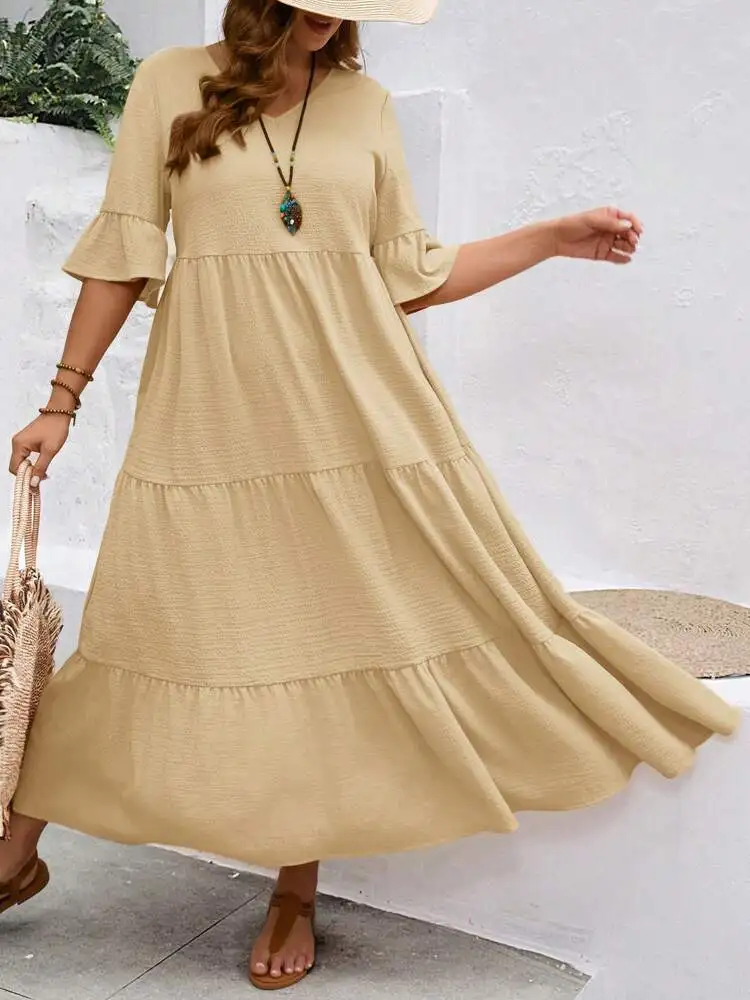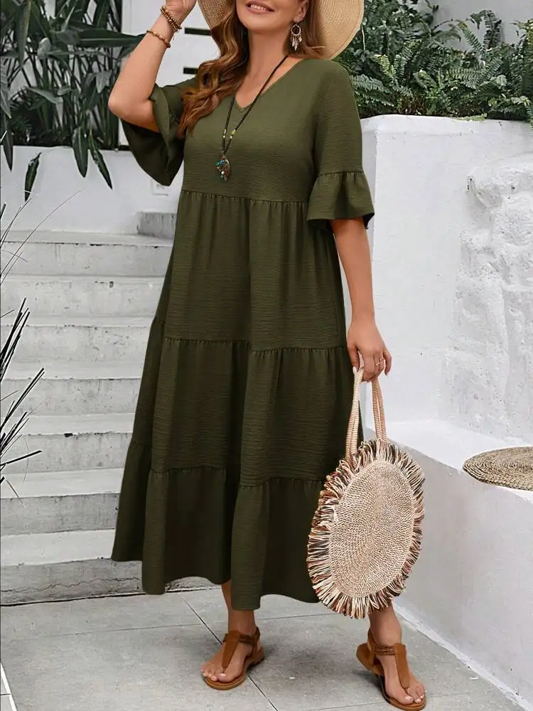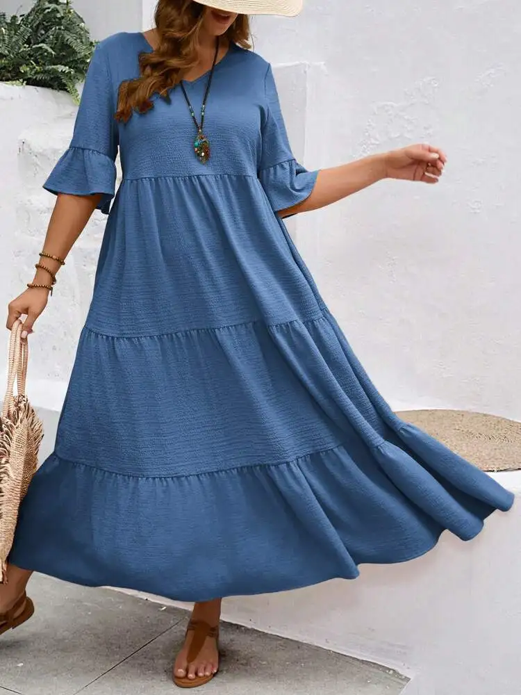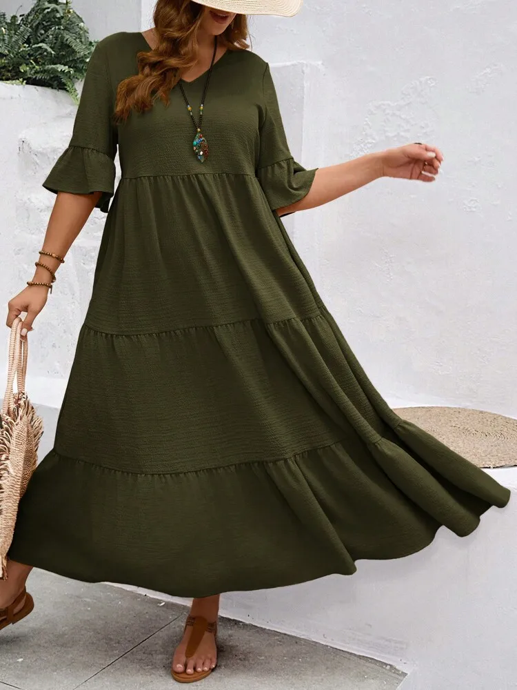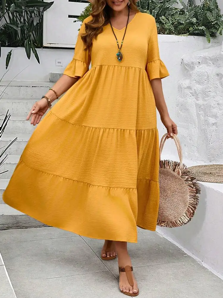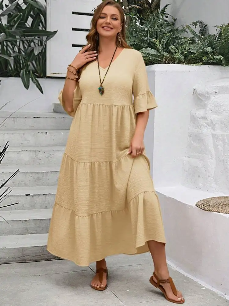 Flow through spring and summer in effortless style with this vibrant, plus-size swing dress. Designed in a flattering V-neck cut with splicing details, this long, loose-fit dress offers a breezy silhouette perfect for beach days or sunny strolls. Made from lightweight polyester with slight stretch, it provides comfort and ease while embracing bold, multicolor tones. Whether you're on vacation or just soaking up warm-weather vibes, this beach-style dress is your go-to for relaxed elegance in a roomy, flowy fit.