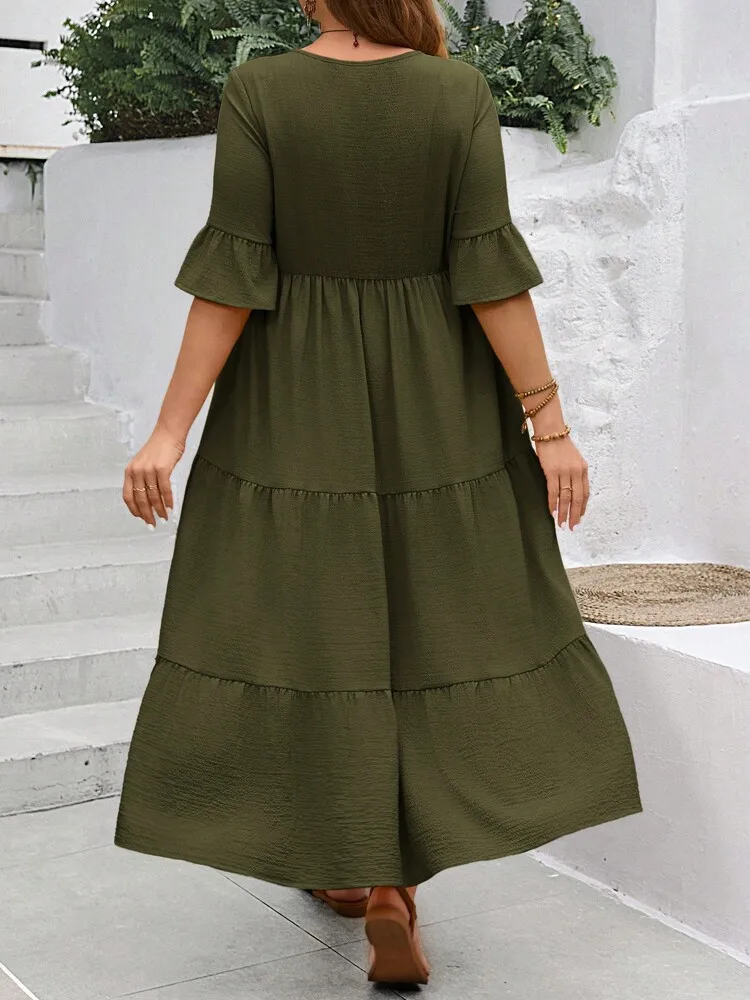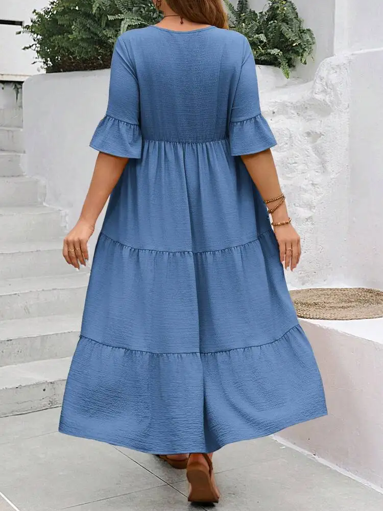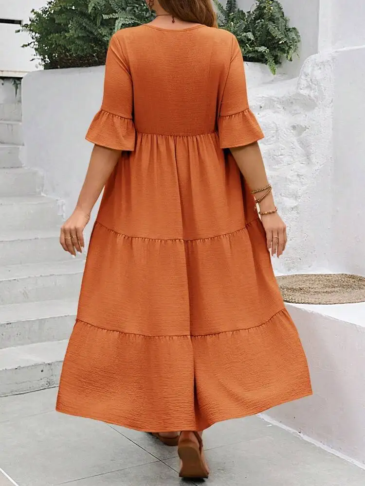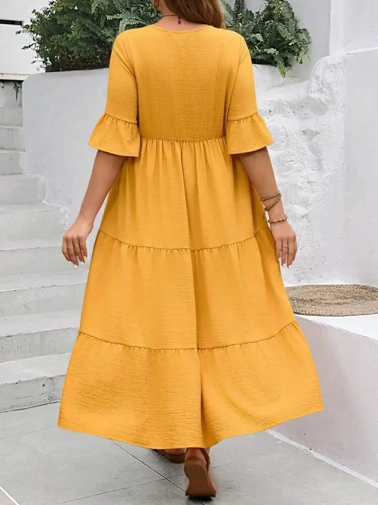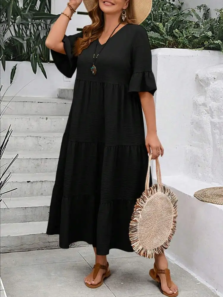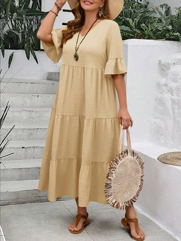 Flow through spring and summer in effortless style with this vibrant, plus-size swing dress. Designed in a flattering V-neck cut with splicing details, this long, loose-fit dress offers a breezy silhouette perfect for beach days or sunny strolls. Made from lightweight polyester with slight stretch, it provides comfort and ease while embracing bold, multicolor tones. Whether you're on vacation or just soaking up warm-weather vibes, this beach-style dress is your go-to for relaxed elegance in a roomy, flowy fit.