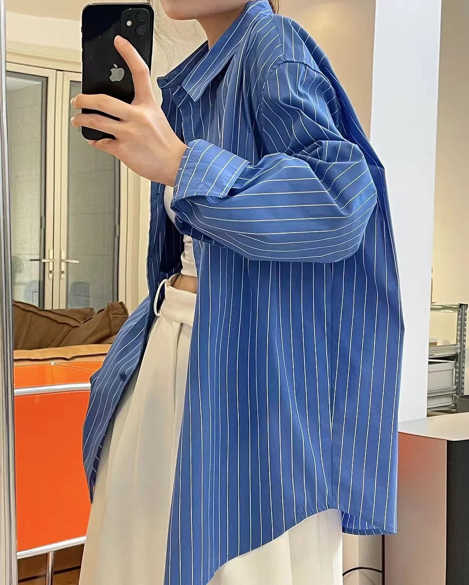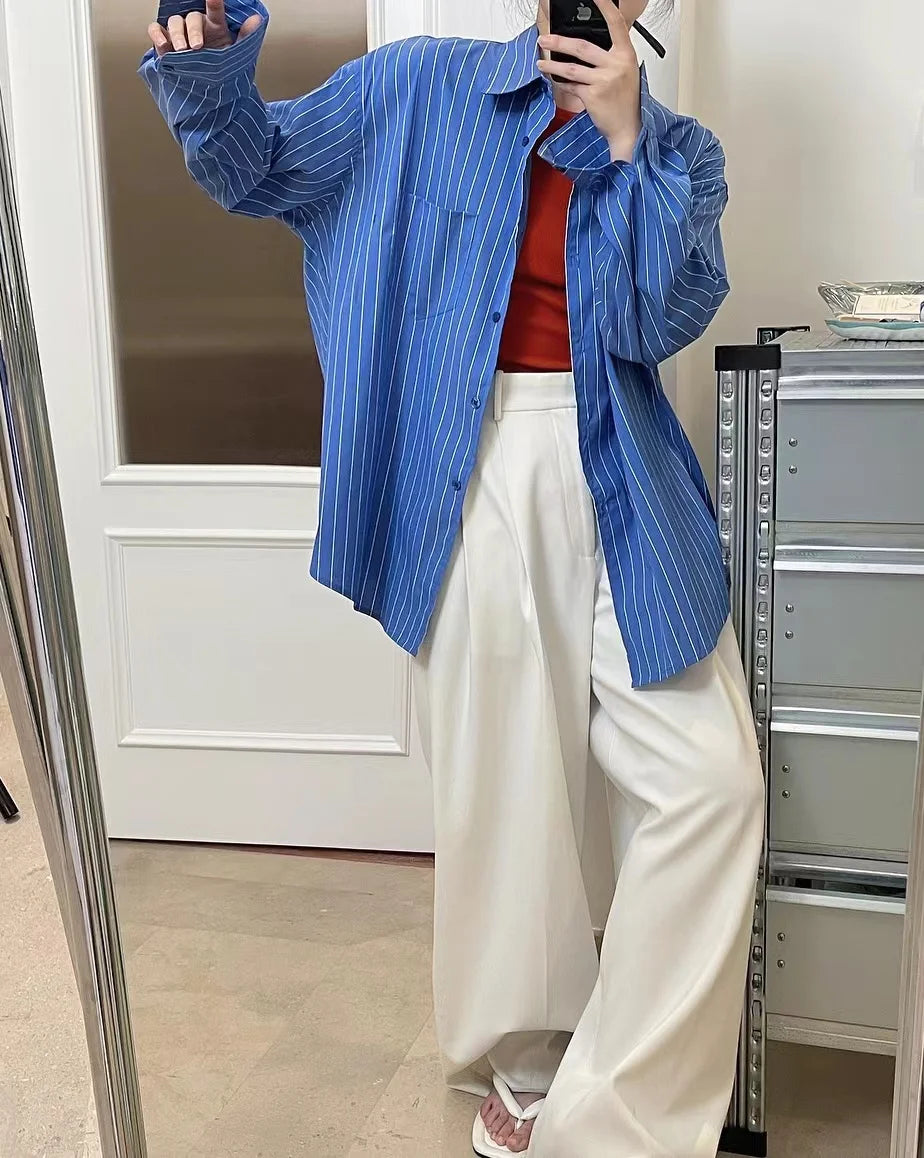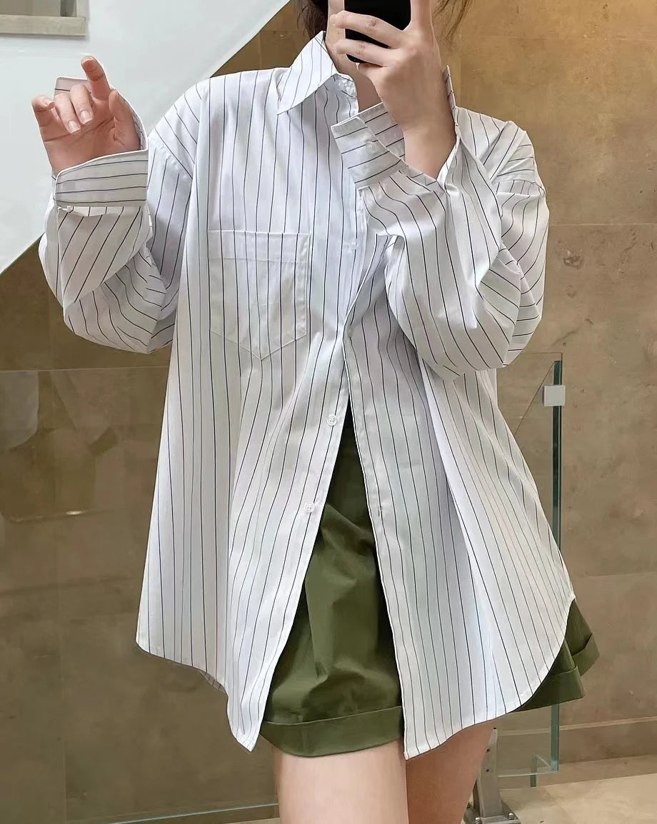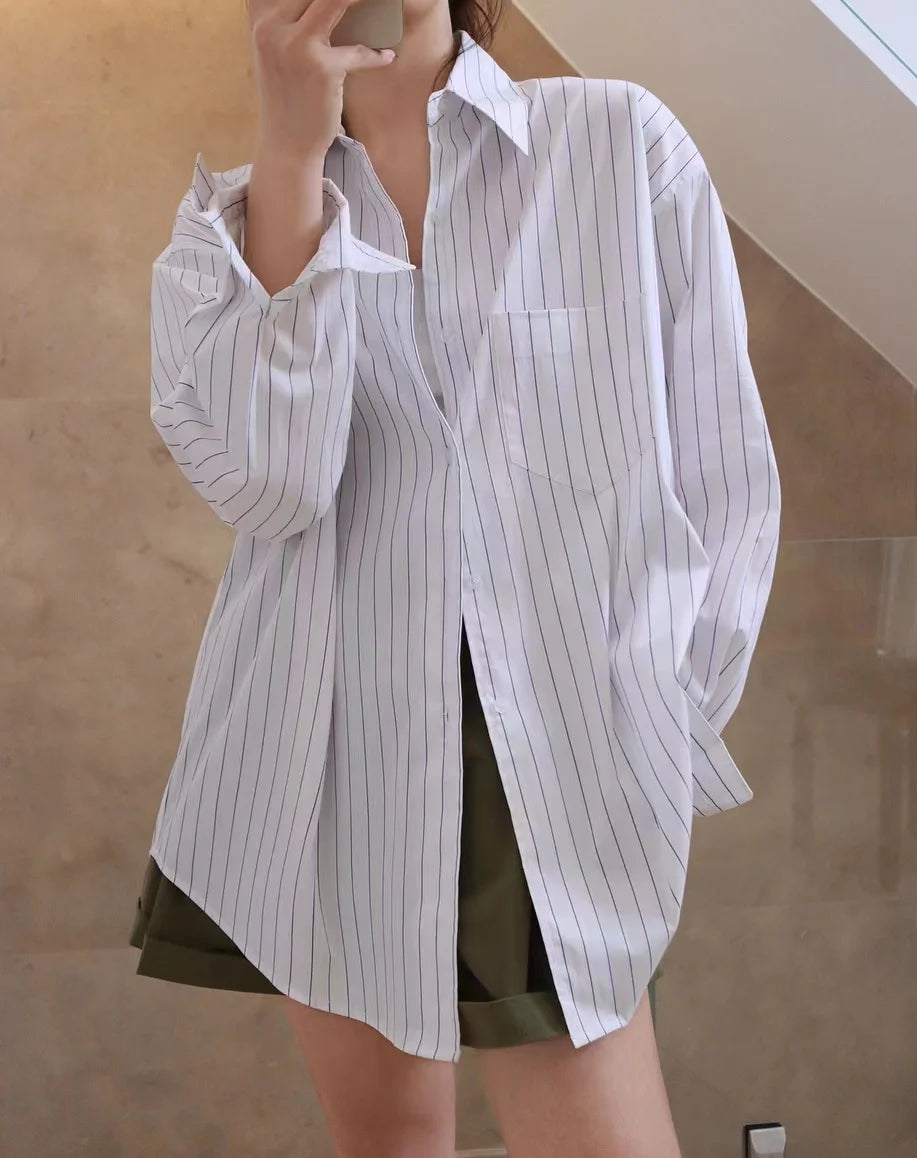Add a timeless touch to your wardrobe with this casual striped shirt, designed for relaxed, everyday wear. Featuring a single-breasted closure, turn-down collar, and practical pockets, this shirt offers a loose, straight fit for all-day comfort. Made from a breathable blend of cotton, spandex, and nylon, it provides a lightweight feel with zero stretch for a structured silhouette. Perfect for pairing with jeans or layering over a tank, this versatile piece is a must-have for effortless, laid-back style.