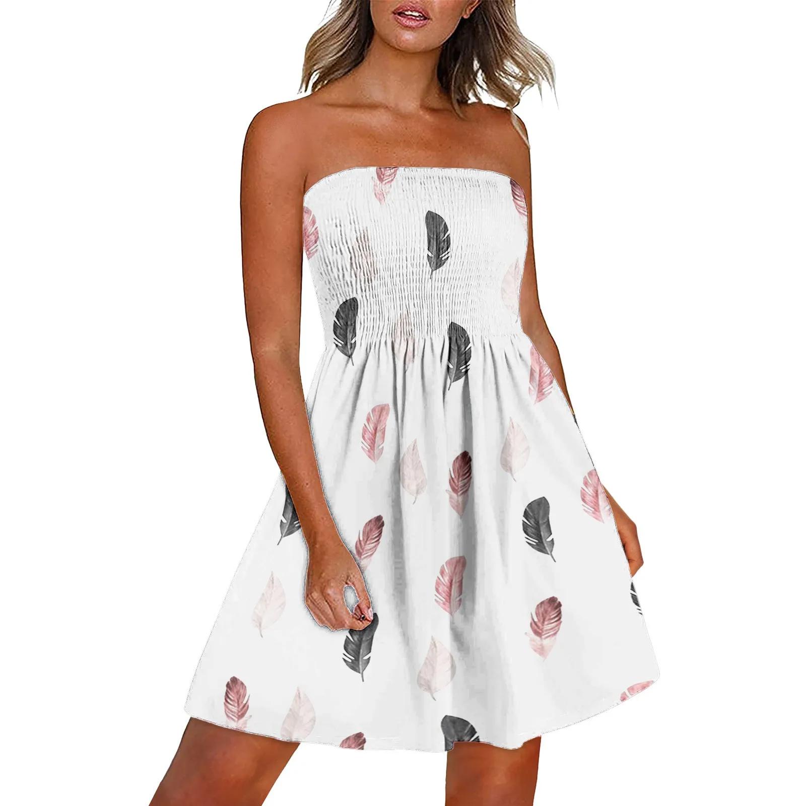 Strapless Off Shoulder Tube Beach Dress Women Feather Print Sleeveless Pleated Short Dress Bandeau Elastic Mini Summer Dress