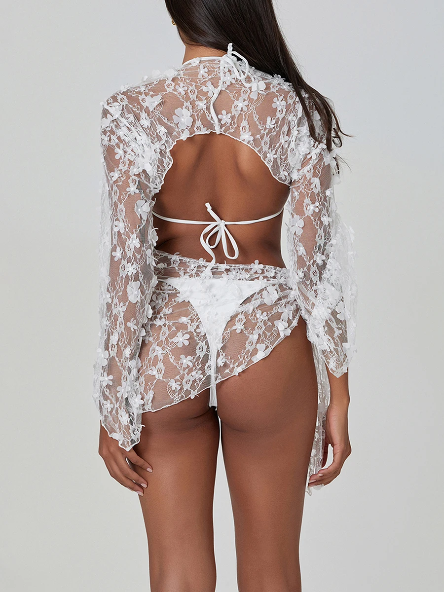 Women 4-Piece Swimsuits Halter Bikini Bra and Elastic Thongs Sheer Skirts Cardigans Sets for Summer BeachwearFeatures