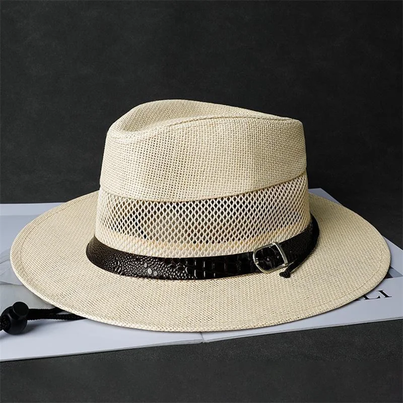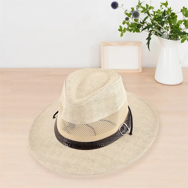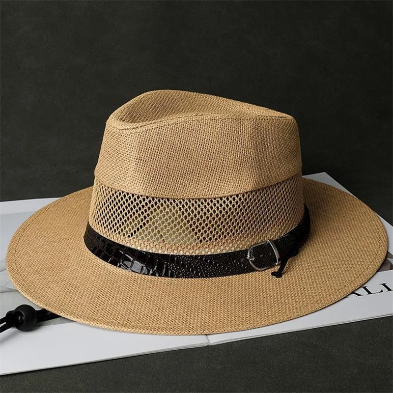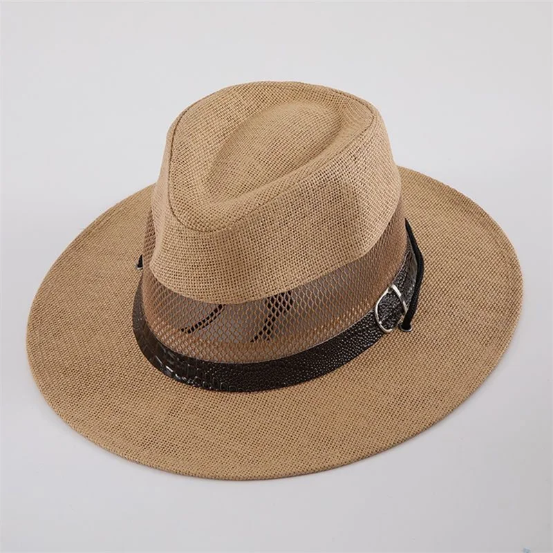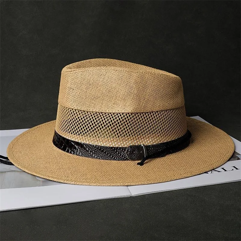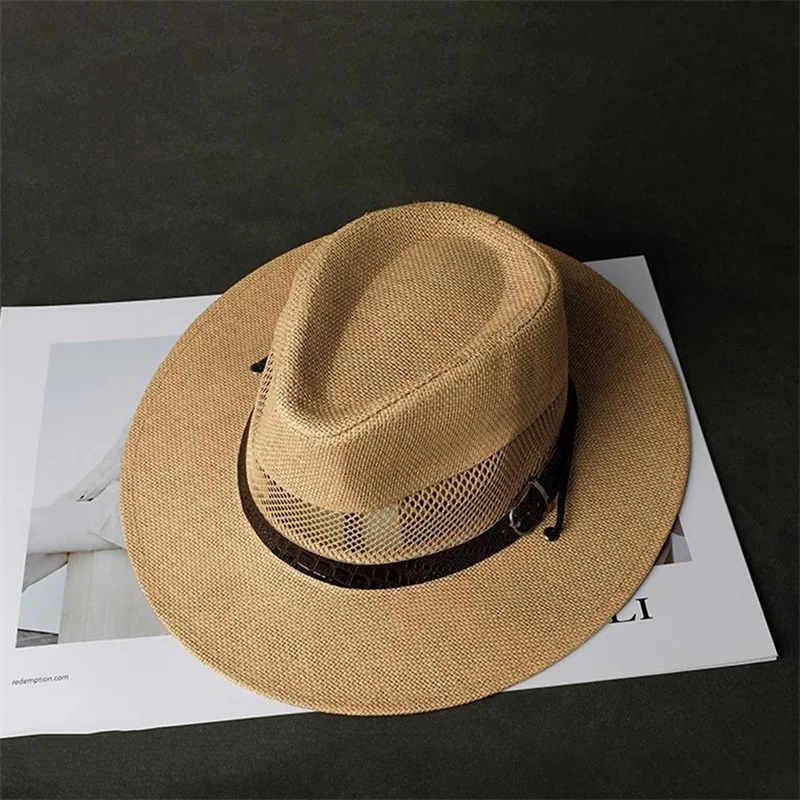 Stylish Unisex Straw Fedora Hat with Hollow Out Design and Black Belt Detail for Summer Beach Vacation or Outdoor Activities