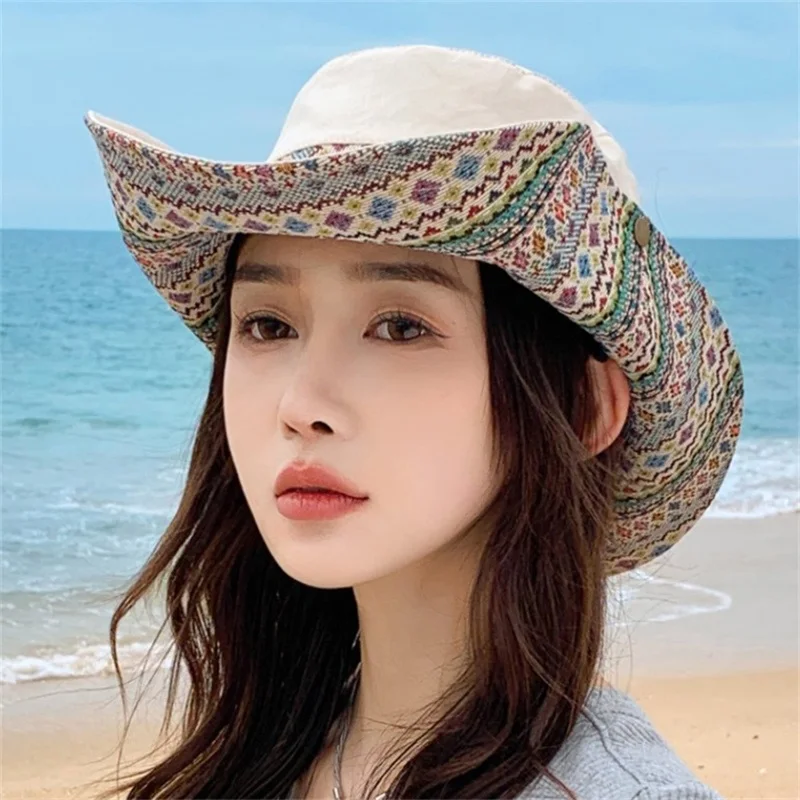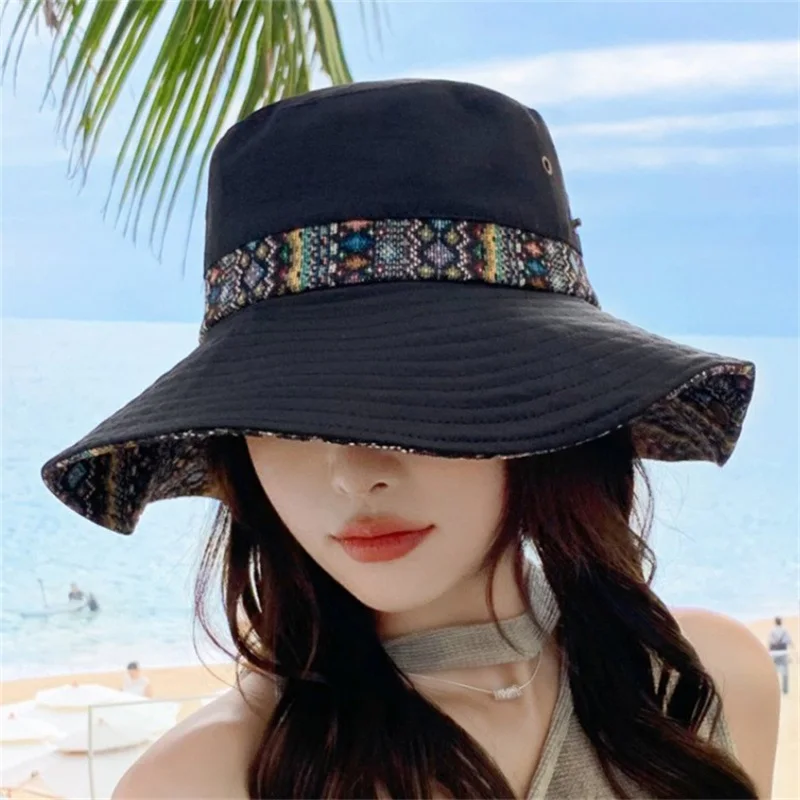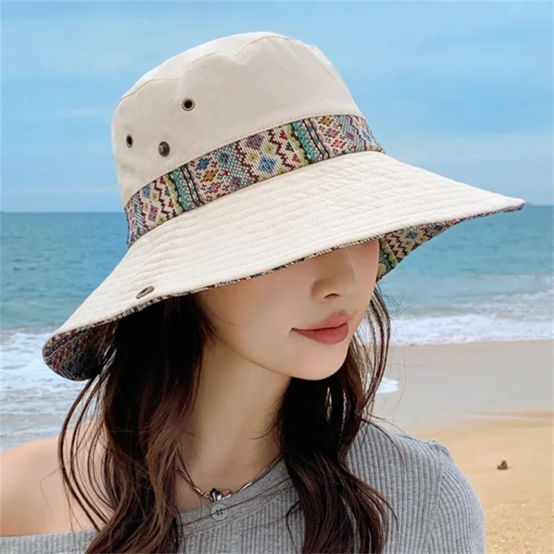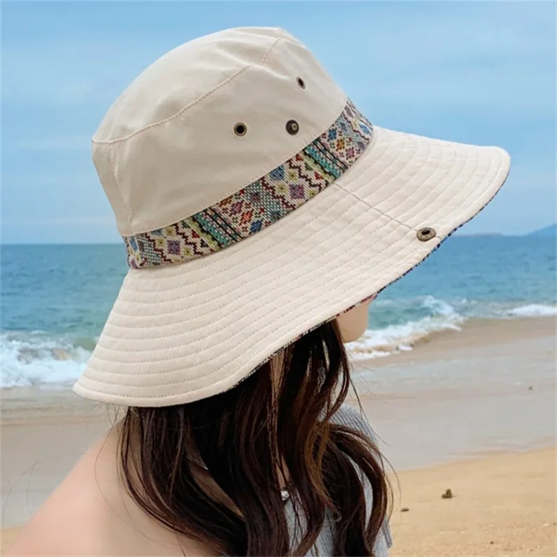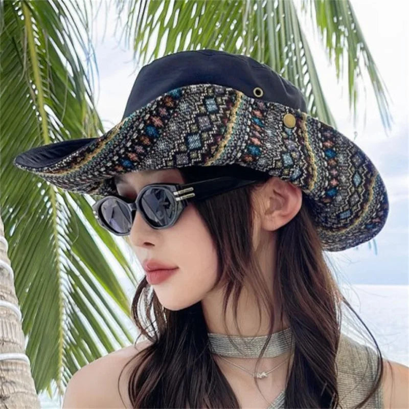Women Trendy Ethnic Fisherman Hat Summer Foldable Wide Brim Sun Protection Holiday Hiking Cap