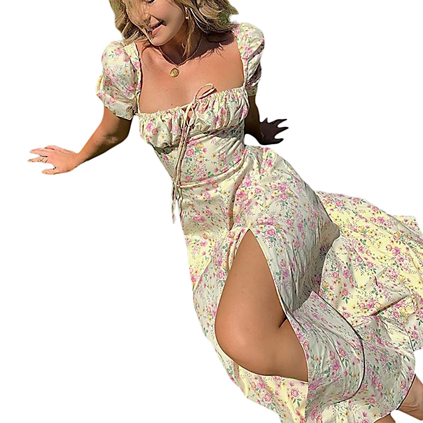 Womens Dress, Puff Short Sleeves Lace Up Chest Floral Printed Skirt