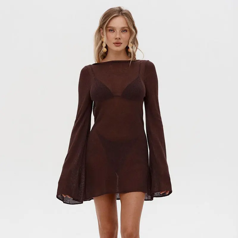 Turn up the heat with this stunning knit beach cover-up, perfect for poolside lounging or seaside strolls. Crafted from lightweight polyester, this solid mini dress features a stylish see-through knit design with a sultry backless cut and flirty bell sleeves. The short length and breathable fabric make it an ideal swimsuit cover-up, combining beach style with effortless allure. A must-have piece for your summer escape.