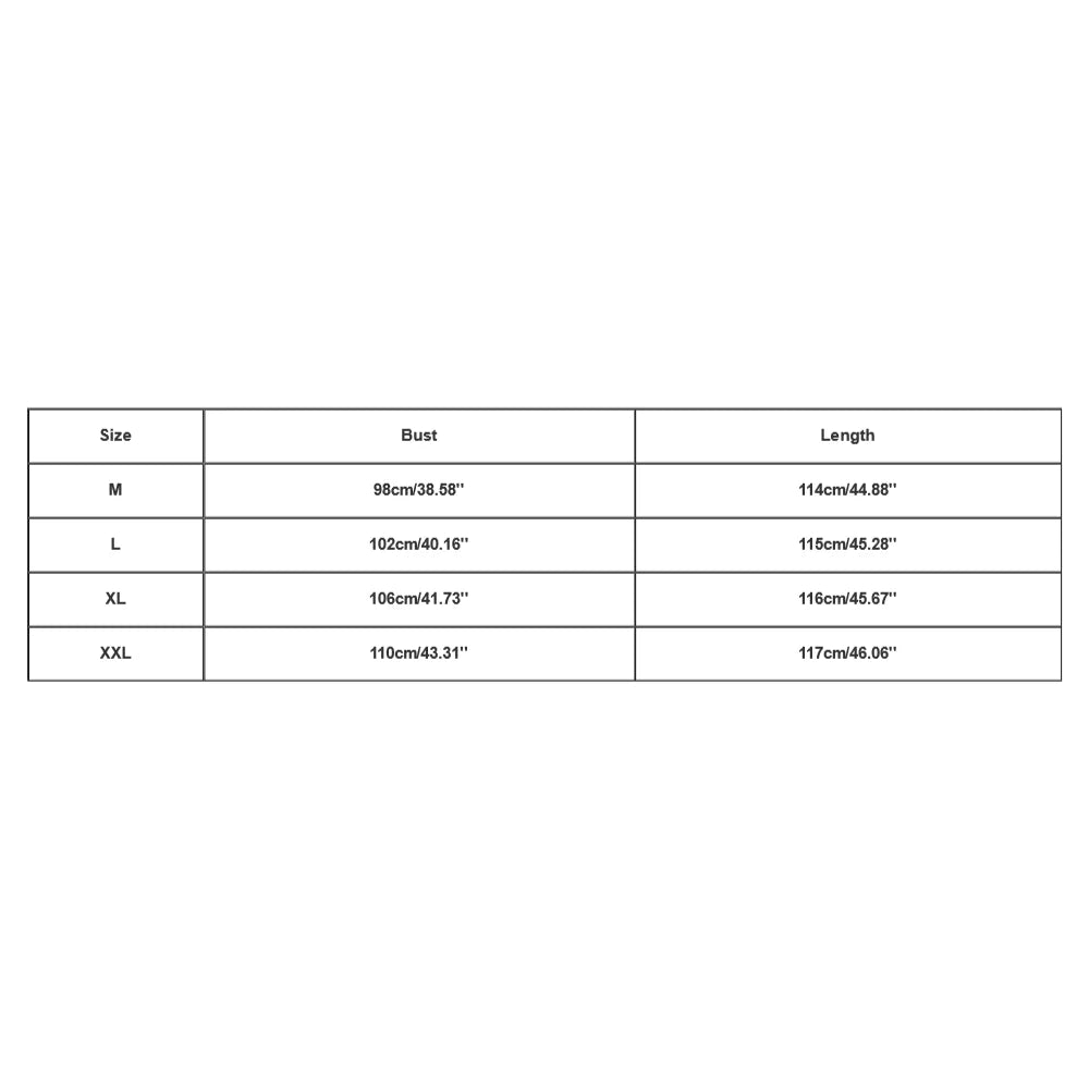 | Size:M | Bust:98cm/38.58'' | Length:114cm/44.88'' |