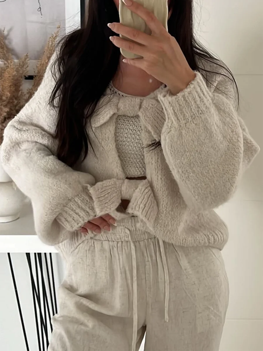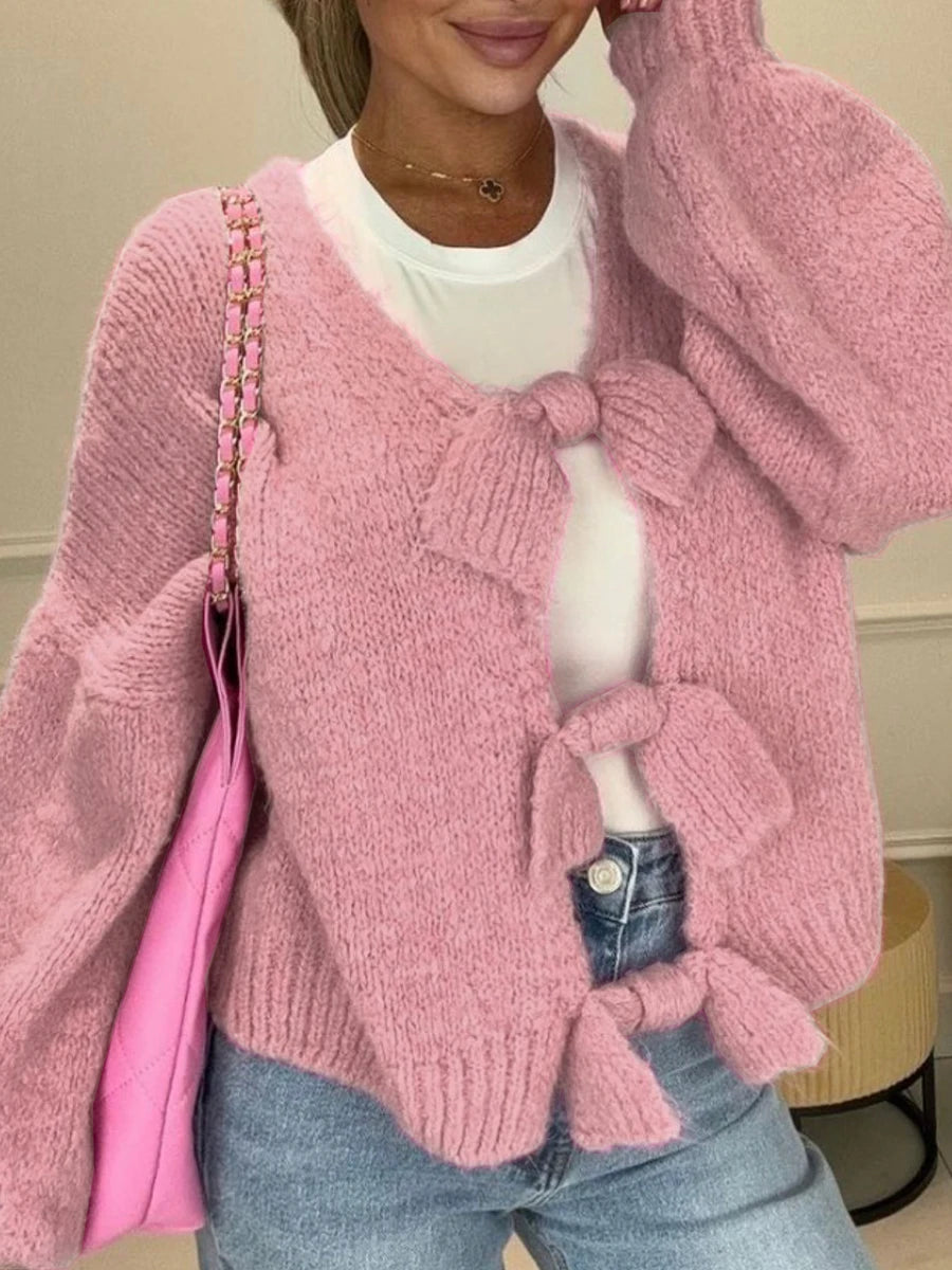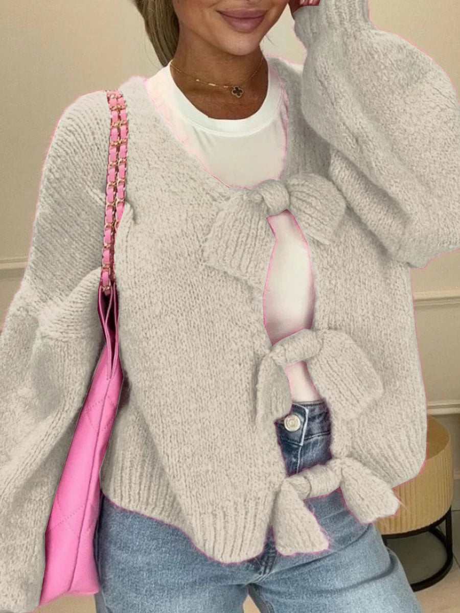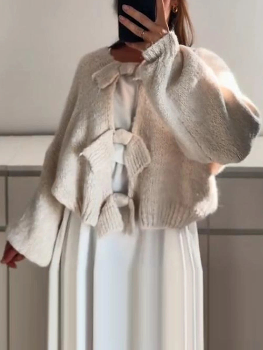 Sweater Knitted Cardigan Elegant Long Lantern Sleeve Front Tie-up Sweaters Tops