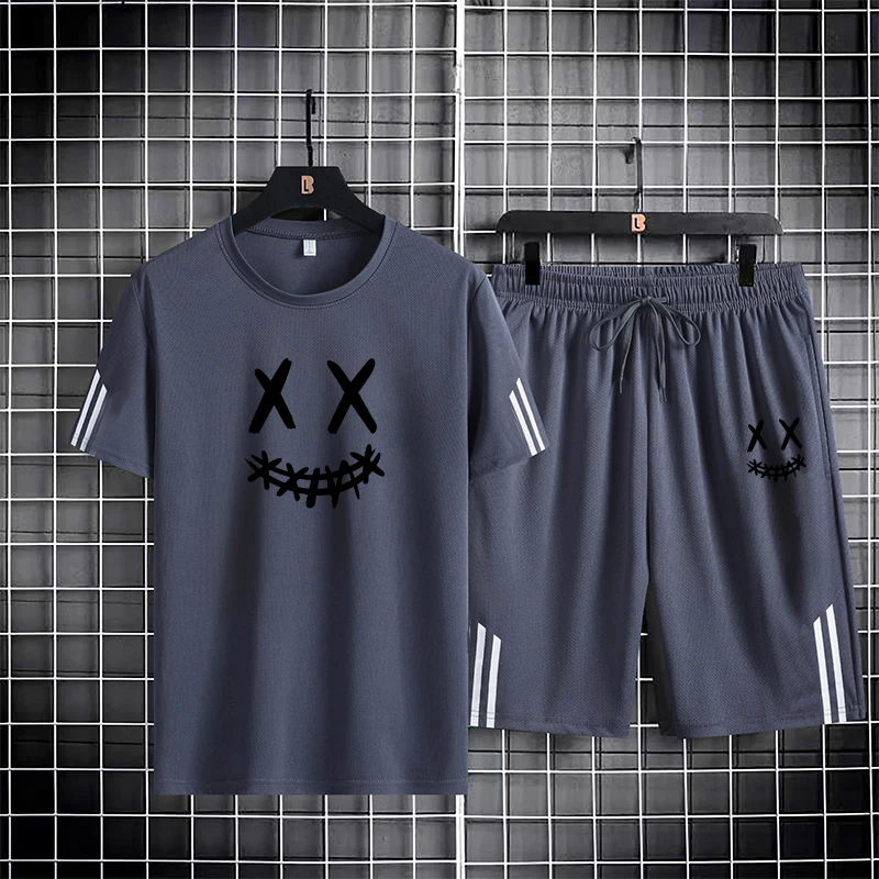 Add a playful touch to your casual summer wardrobe with this trendy men's two-piece sports set. Featuring a smiling face print and stylish three-bar design, the breathable mesh T-shirt with a classic round neck pairs effortlessly with matching elastic waist shorts. Made from lightweight knit polyester, this set is perfect for staying cool, comfortable, and stylish during laid-back days or light outdoor activities.
