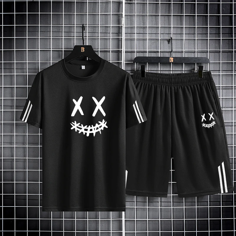Three bar trendy men's printed sports set with smiling face pattern, mesh breathable round neck T-shirt, two-piece pants set new