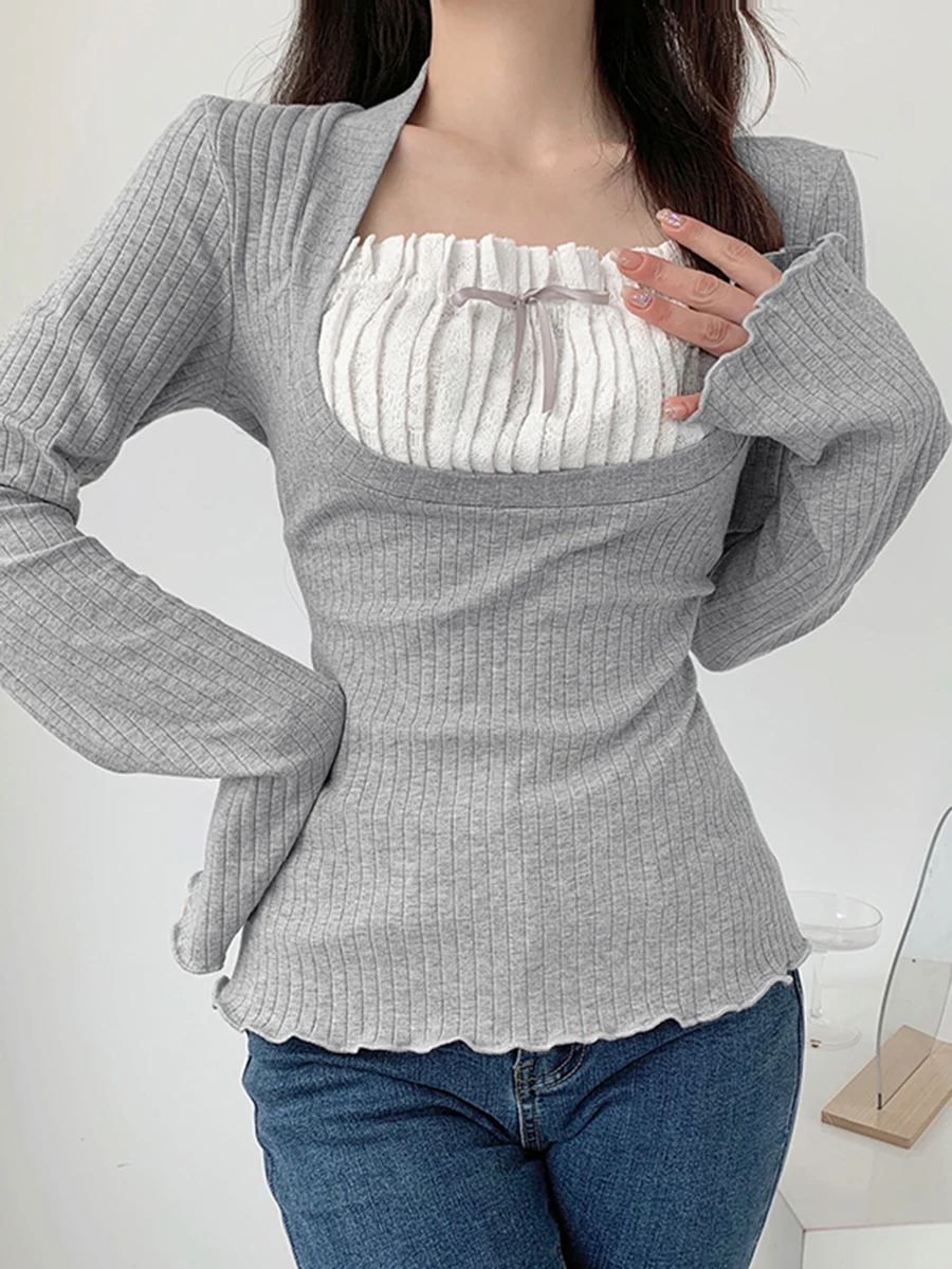 Women's Spring Autumn Slim Tops Gray Long Sleeve Square Neck Contrast Color T-shirt