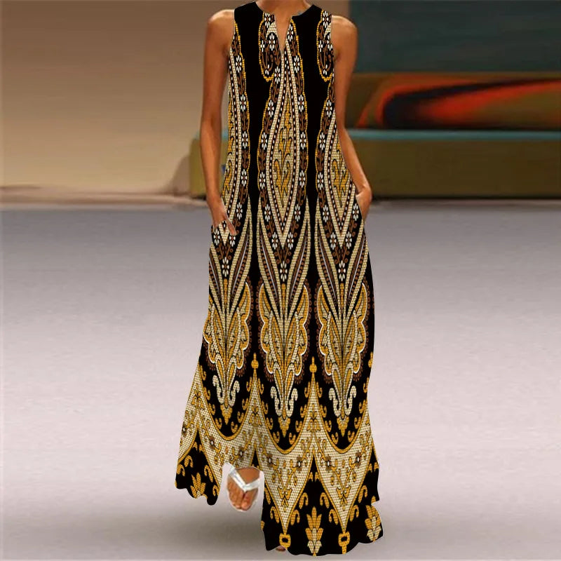 Vintage Print Maxi Dress For Women Summer Loose Sleeveless Long Dresses Elegant Lady V Neck Pocket Boho Beach Sundress Vestidos