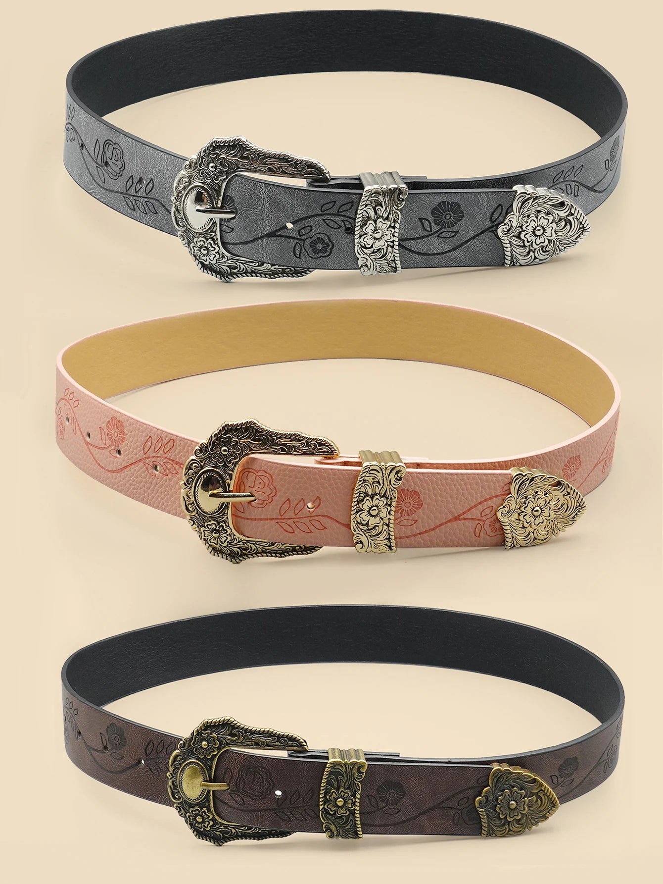 Western Style Printed Solid Color Pu Belt Buckle, Retro Casual Women's Belt, Classic Jeans Decorative Belt
