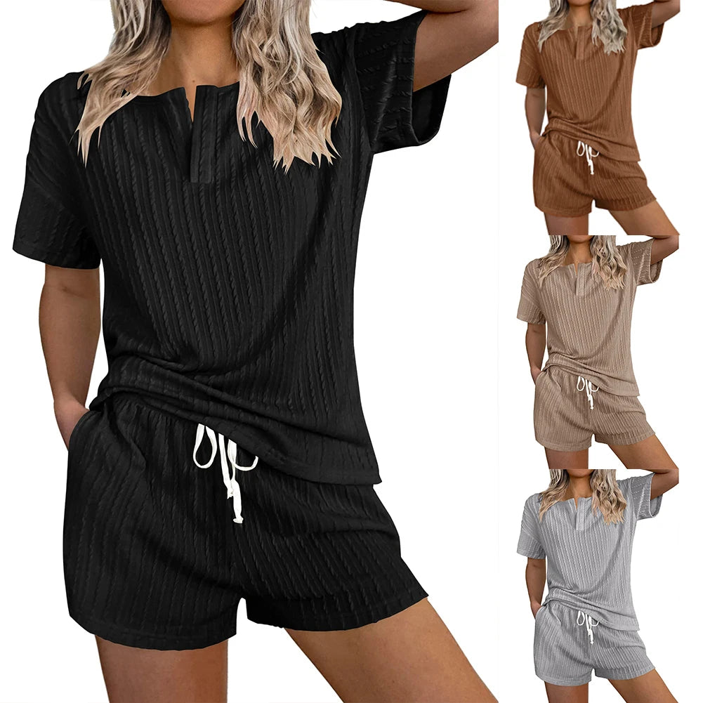 Women 2 Piece Lounge Sets Casual Style V Neck 2 Piece Pajamas Sets Solid Color Ribbed Knit Tops Shorts