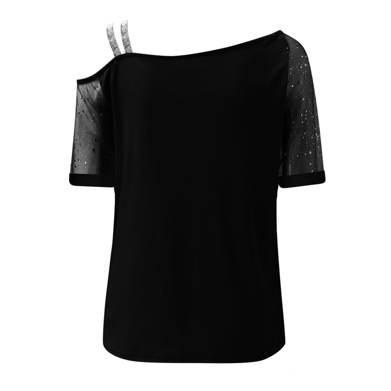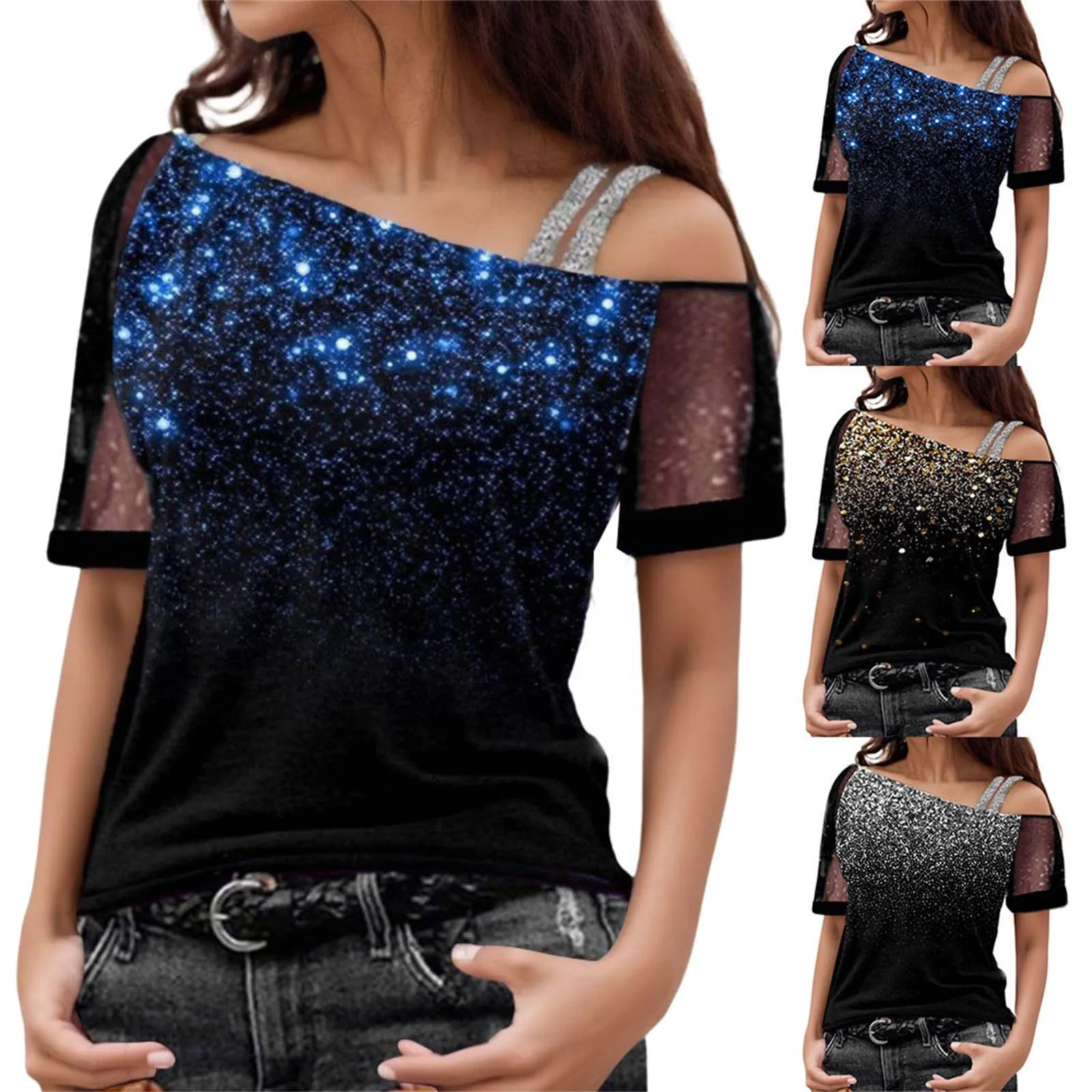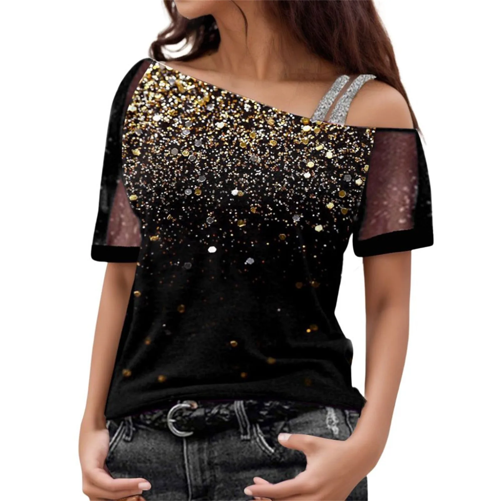 Women Fashion Top Shirt Off Shoulder Top Sexy Glitter Short Sleeve Printed Elegant Shirt Loose Blouse Top Sleeve T Shirt
