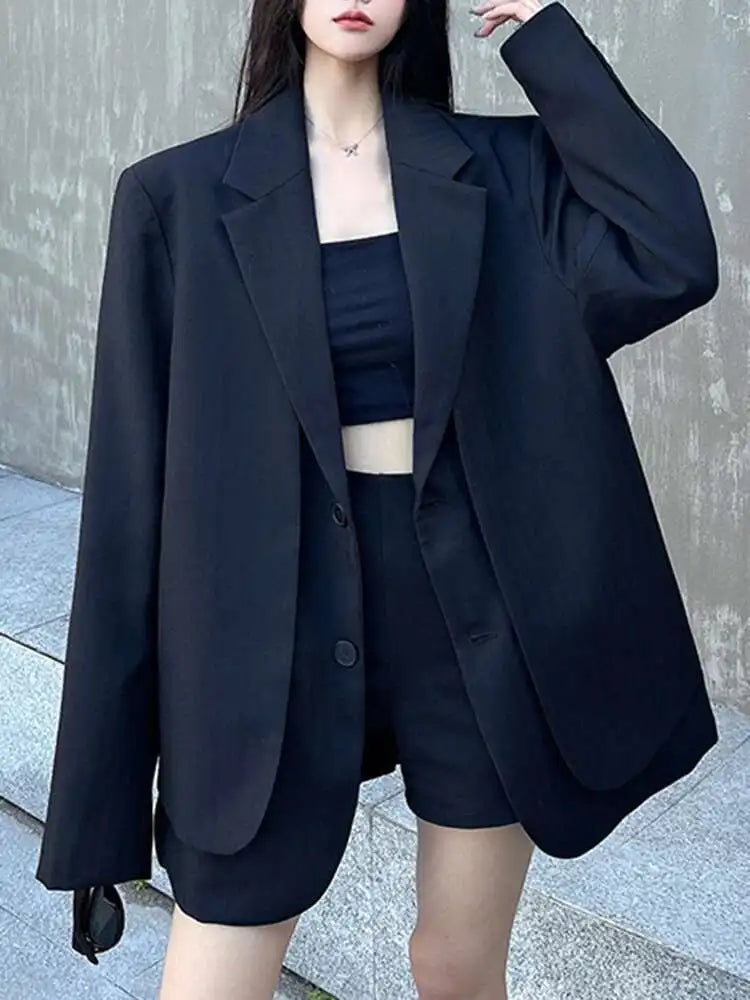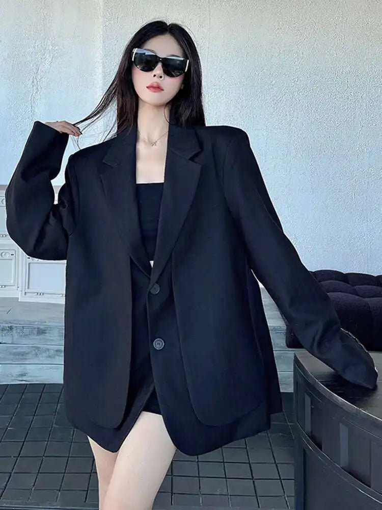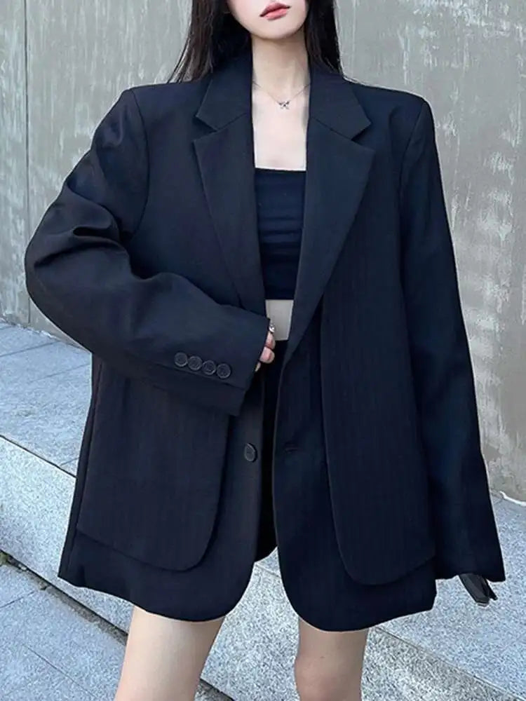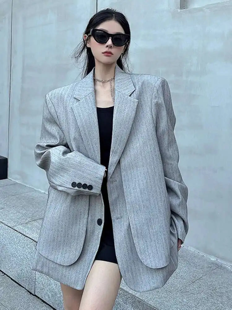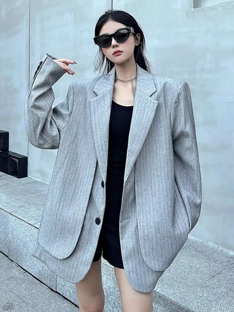 Women Gray Fake Two Pieces Big Size Blazer Lapel Long Sleeve Shoulder Pad Jacket Fashion