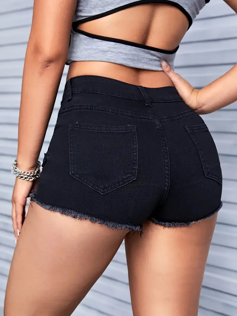 This is a pair of black denim shorts with a button-down design, three buckles in the front, and a raw hem. With high elastic fabric, it can show off your figure very well.