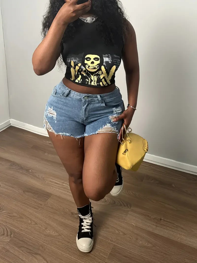 Women New Irregular Ripped Denim Shorts Elastic Fringe High-waisted Shorts Fashion Denim Shorts