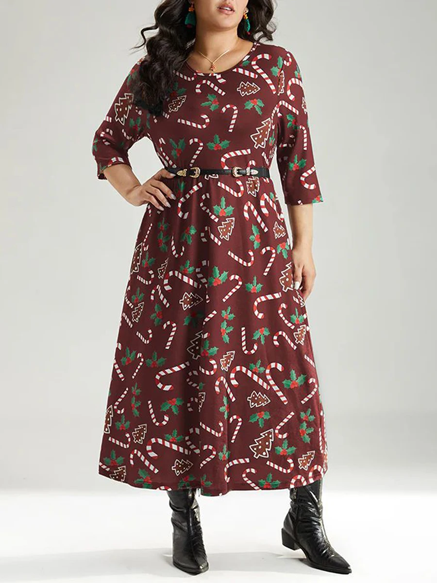 This ankle-length dress features a candy cane print, bringing a fun and festive vibe to the design. Made from velvet, the fabric is soft and luxurious, but it has non-stretch elasticity, offering a more structured fit. The regular fit ensures comfort and a flattering silhouette, with the A-line silhouette emphasizing a feminine shape. The O-neck neckline and three-quarter sleeves create a classic, modest look, while the natural waistline enhances the dress's flattering shape. Perfect for holiday or casual events, this dress combines festive charm with elegant comfort, especially in plus size.