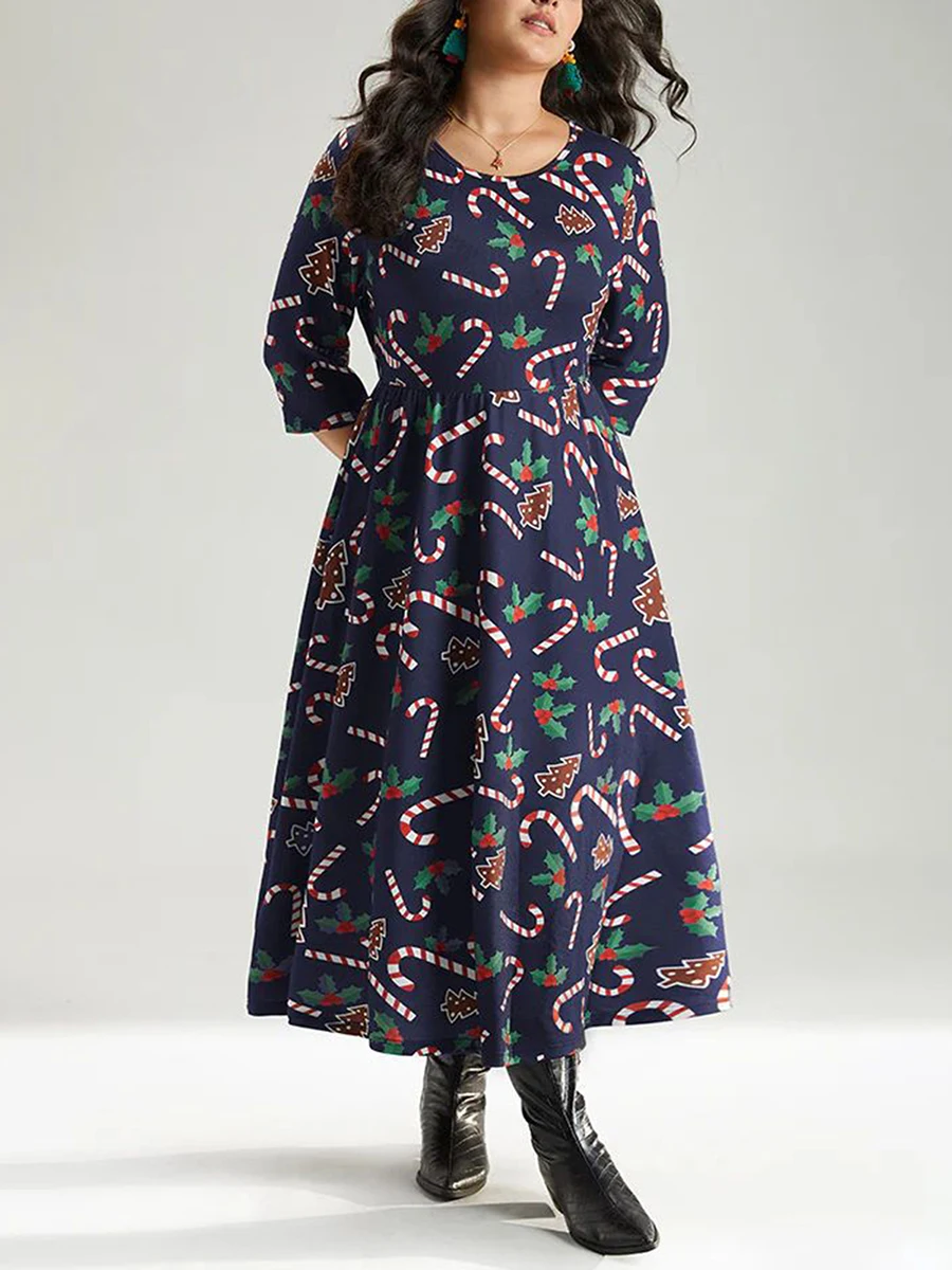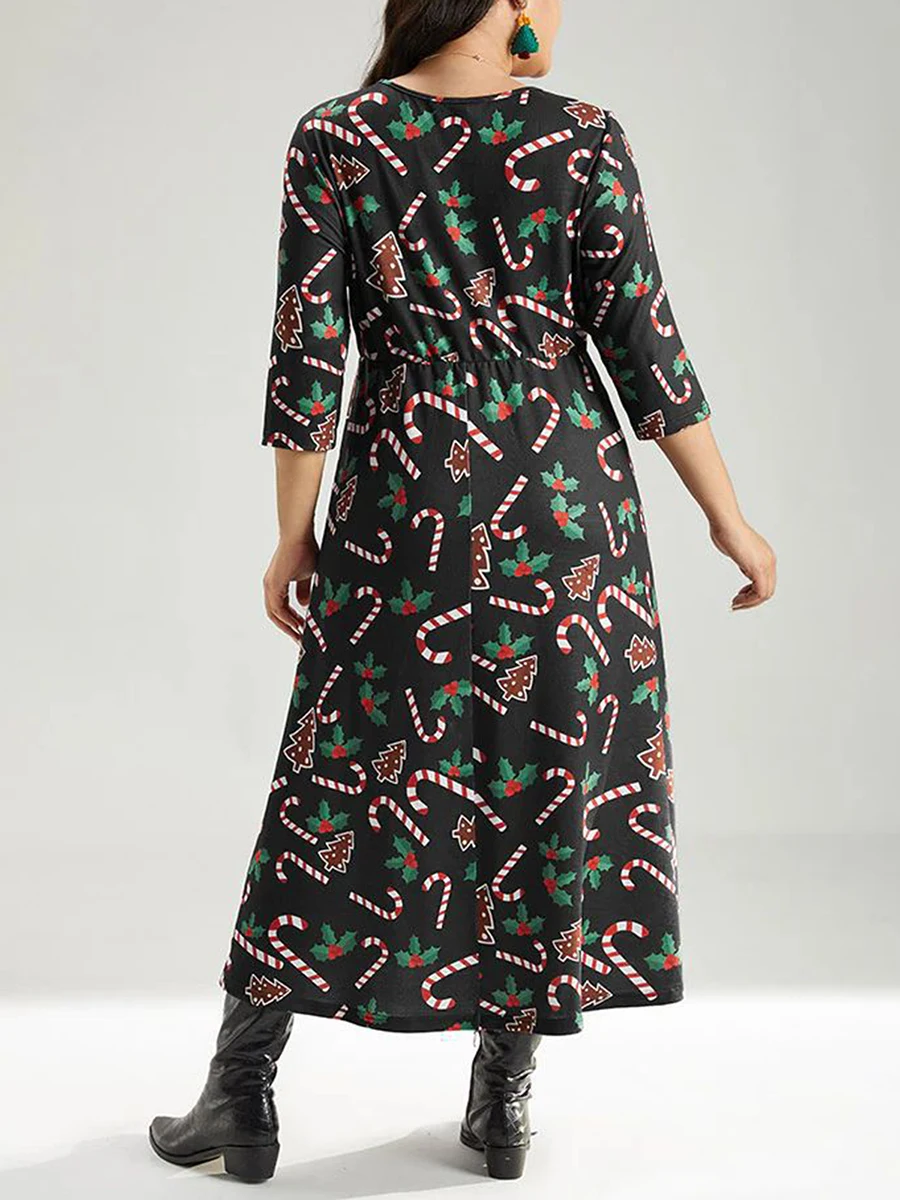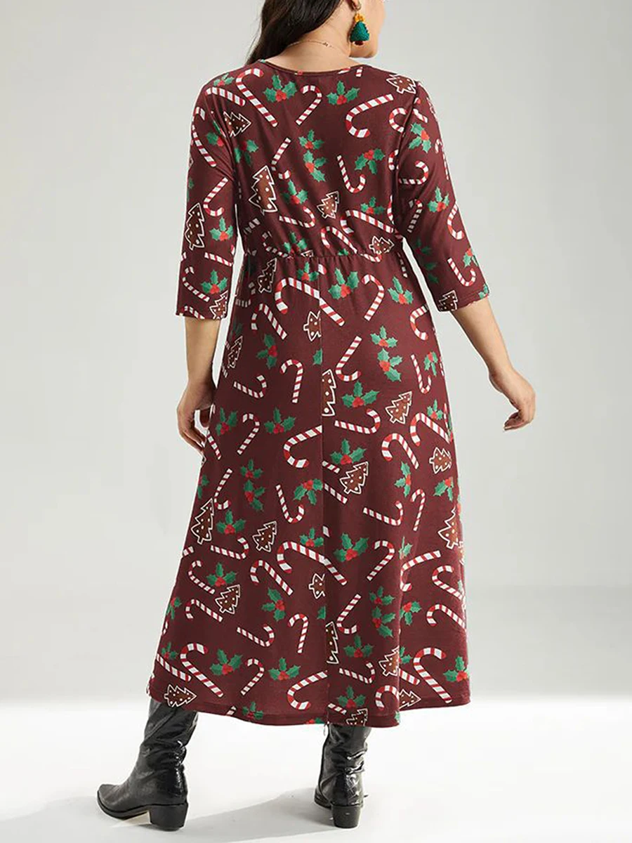 Women Plus Size Dress Candy Cane Print O-Neck 3/4 Sleeve Maxi Dress Winter Elegant Christmas Party Dress for Curvy Ladies