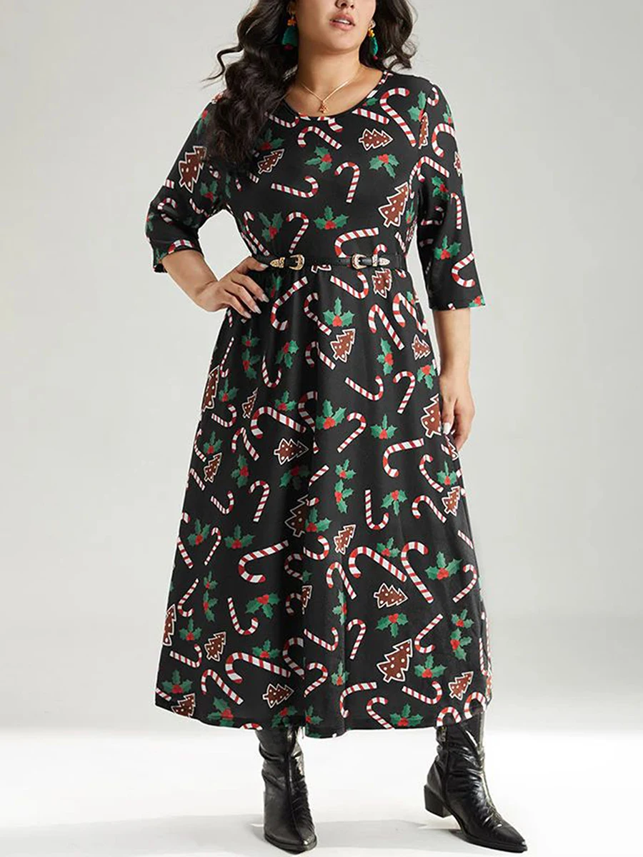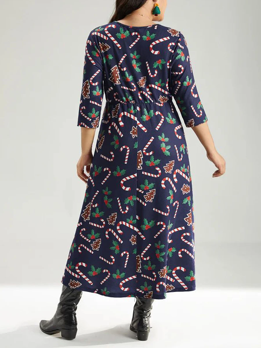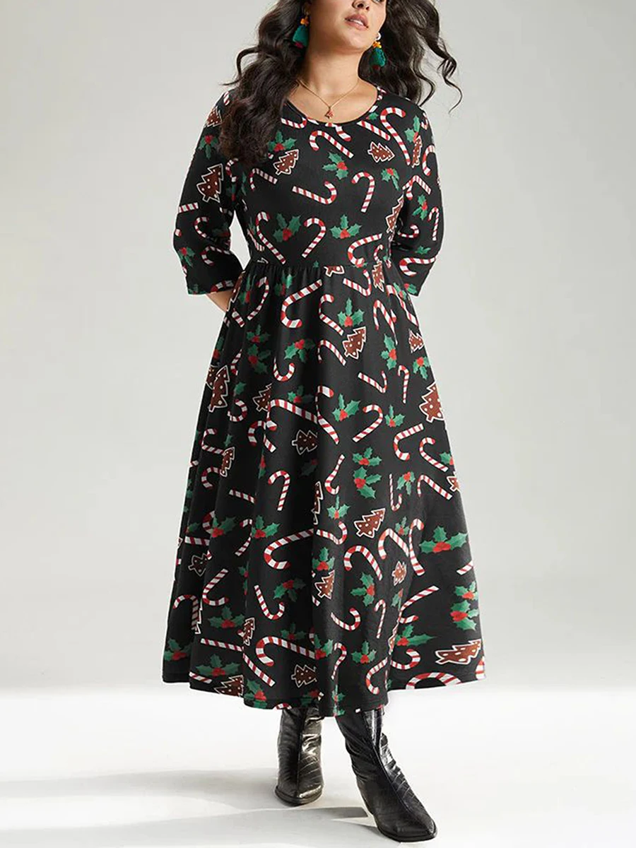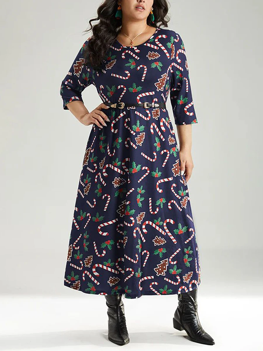 Women Plus Size Dress Candy Cane Print O-Neck 3/4 Sleeve Maxi Dress Winter Elegant Christmas Party Dress for Curvy Ladies