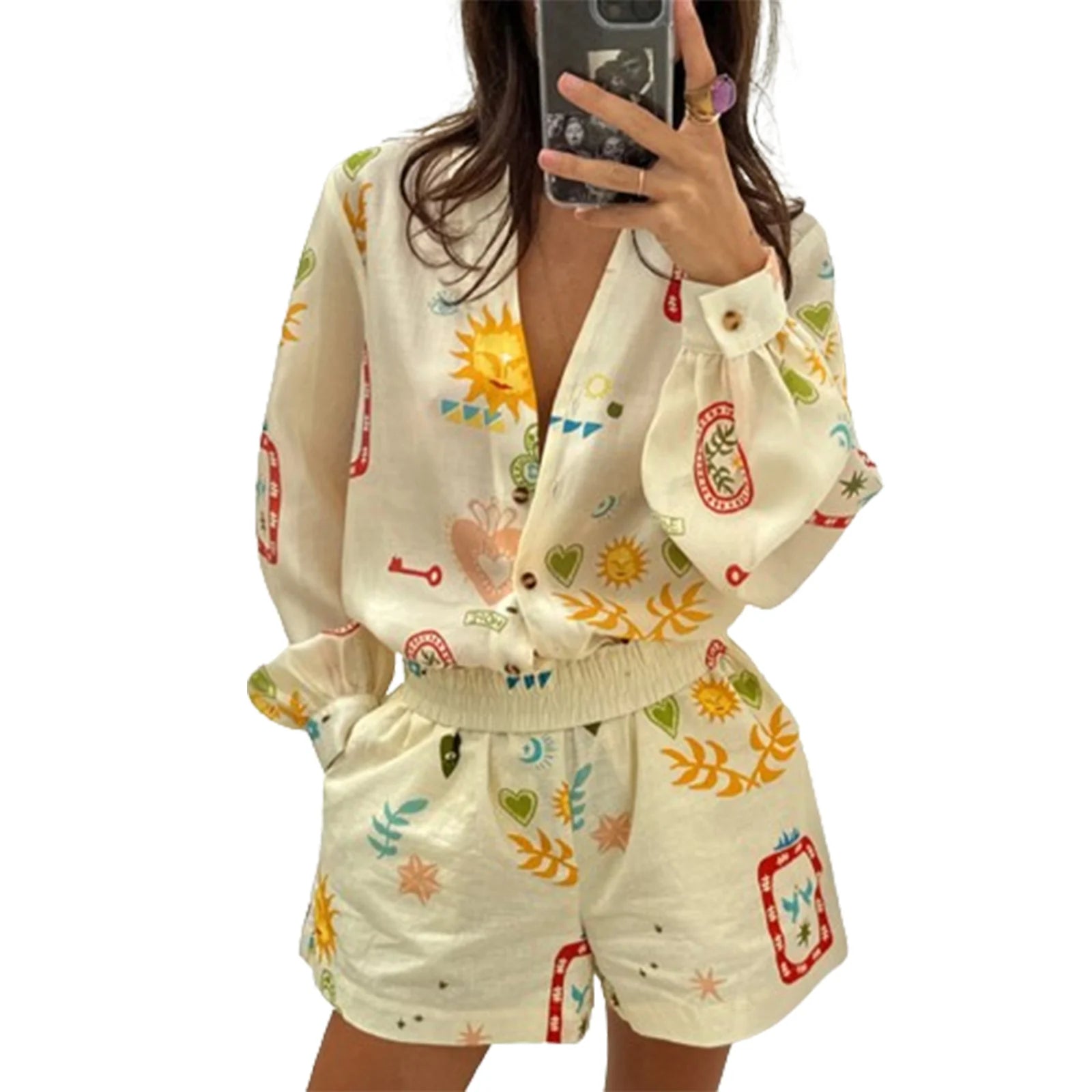 Women's 2 Piece Club Outfits Long Sleeve V Neck Pattern Print Button Up Tops Wide Leg Shorts Sets