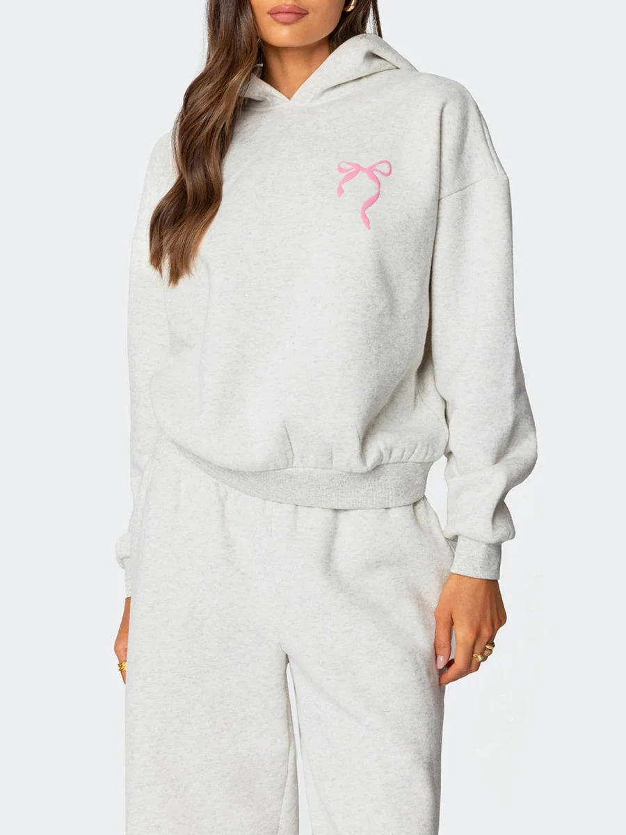 Stay cozy and stylish with this hooded two-piece set, designed for a relaxed yet trendy look. The loose-fit pullover top features a hooded collar and a charming embroidered bow detail, adding a touch of elegance to the casual design. Made from 96%+ synthetic fiber with TAT weaving, this set offers a soft, breathable feel. The high-waist ankle-length pants come with an elastic waistband for all-day comfort and effortless wear. Perfect for lounging, casual outings, or streetwear styling, this set blends comfort and chic appeal for a must-have wardrobe staple!