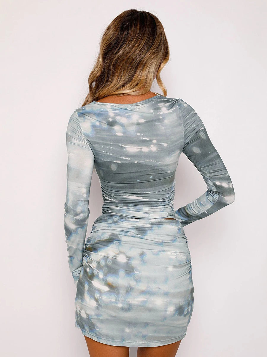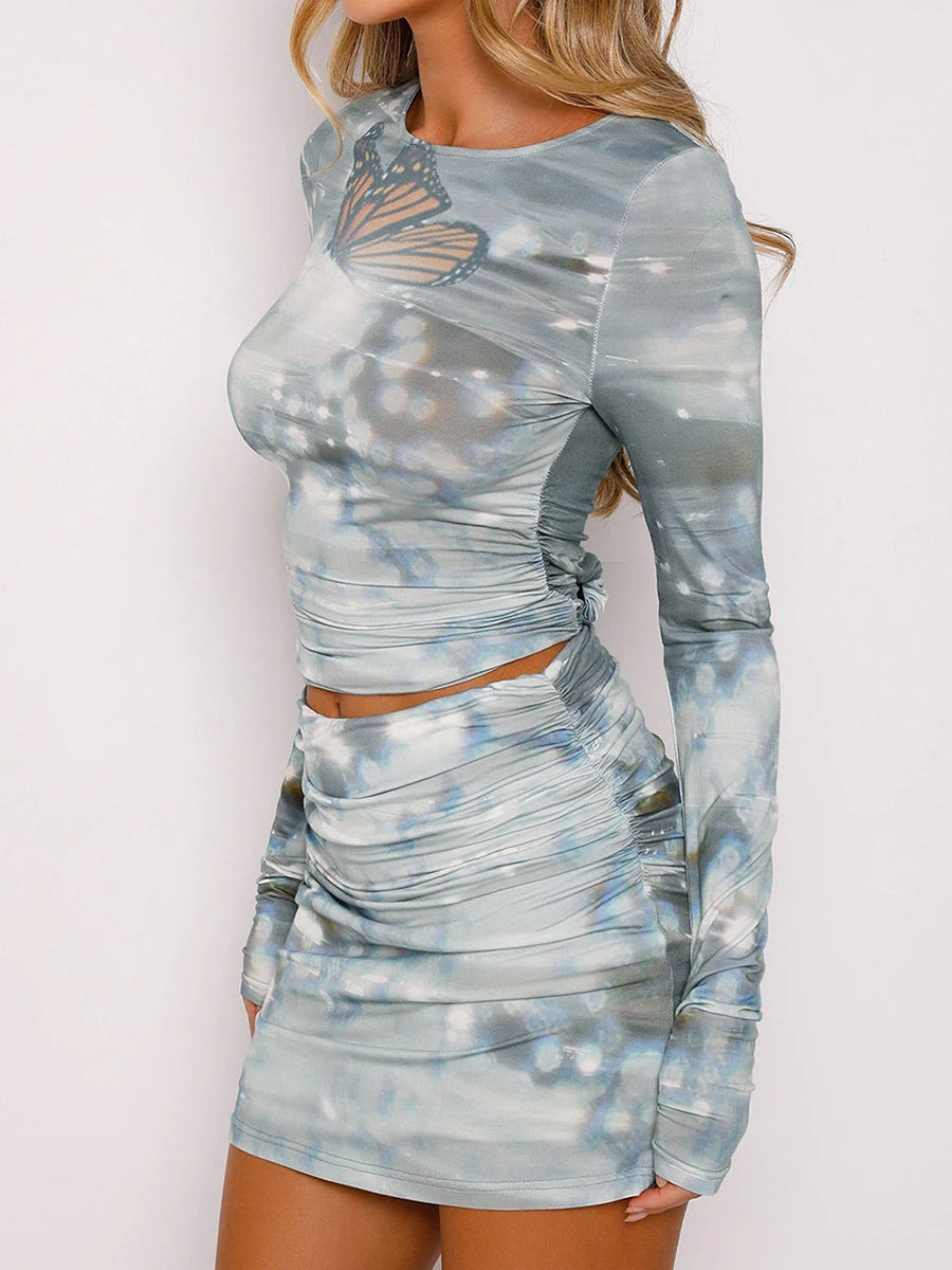 Womens 2 Piece Summer Outfits Long Sleeve Butterfly Print Ruched Crop Tops + Mini Skirt Set Clubwear