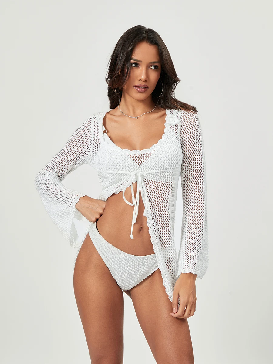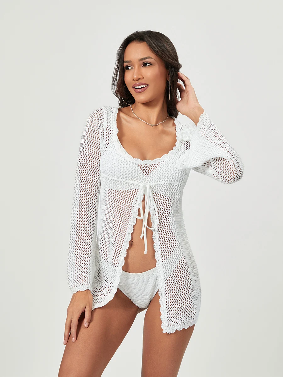 Women s Beachwear Cover Up Hollow Out Crochet Long Sleeve Tie-Up Swimsuit Coverup Solid Color Bathing Suit Cover Ups Summer