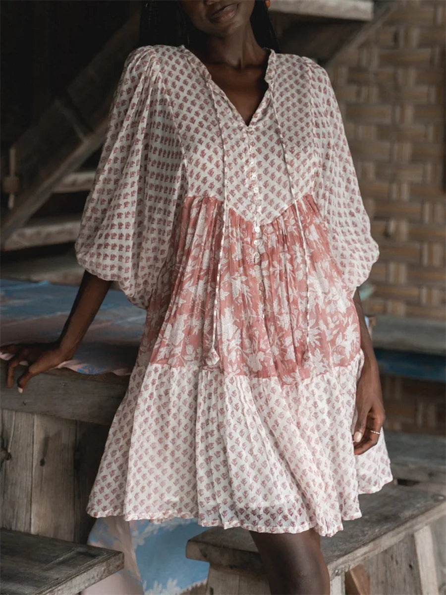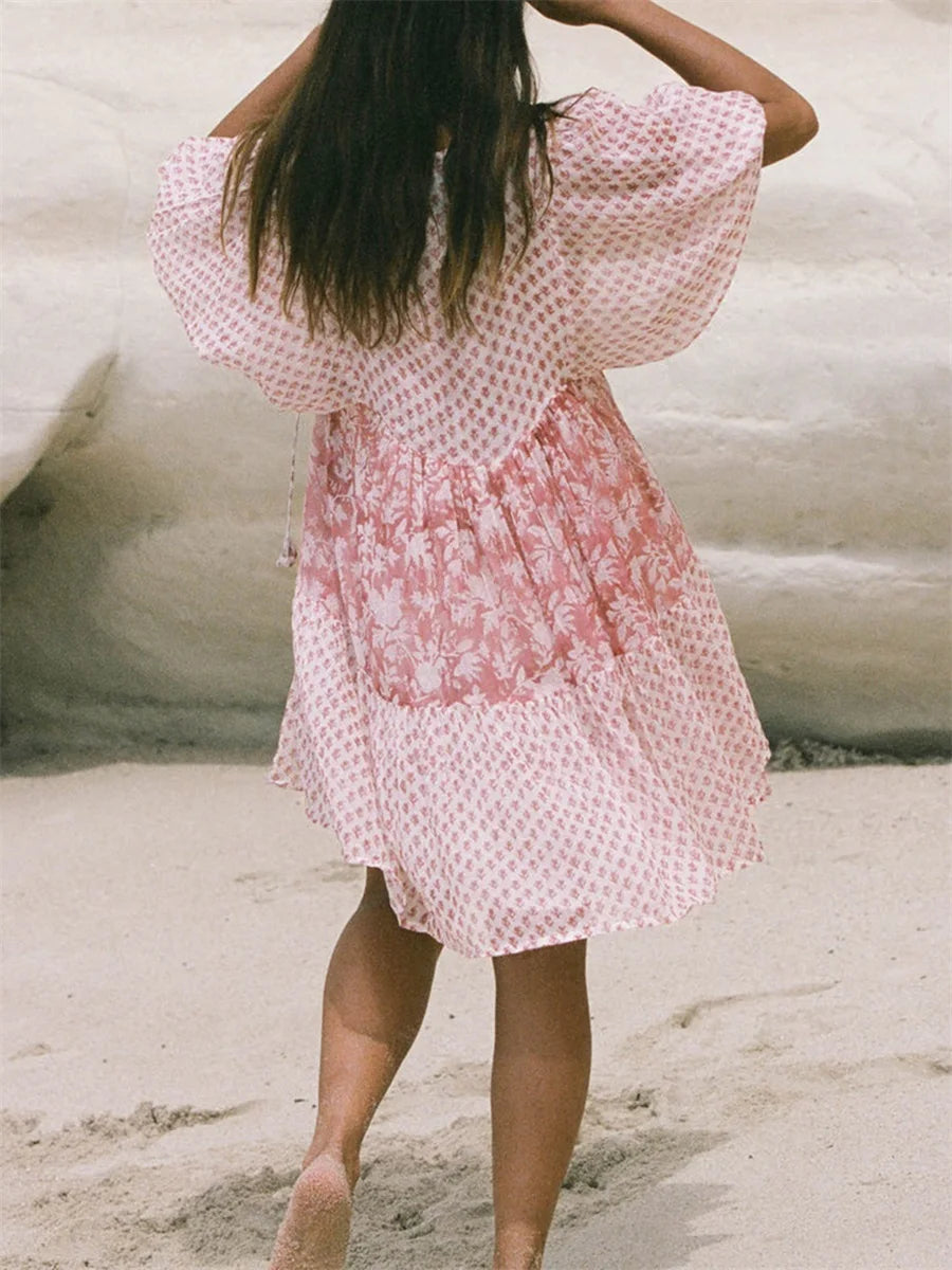 Women's Summer Mini Dress Puff Sleeve Floral Print Button Down Loose Dress Casual Beach Dress