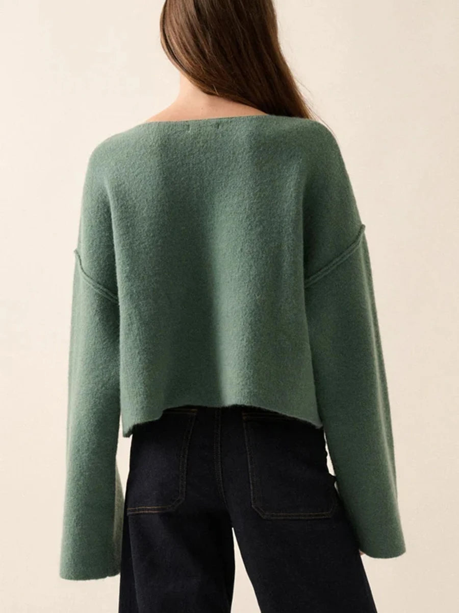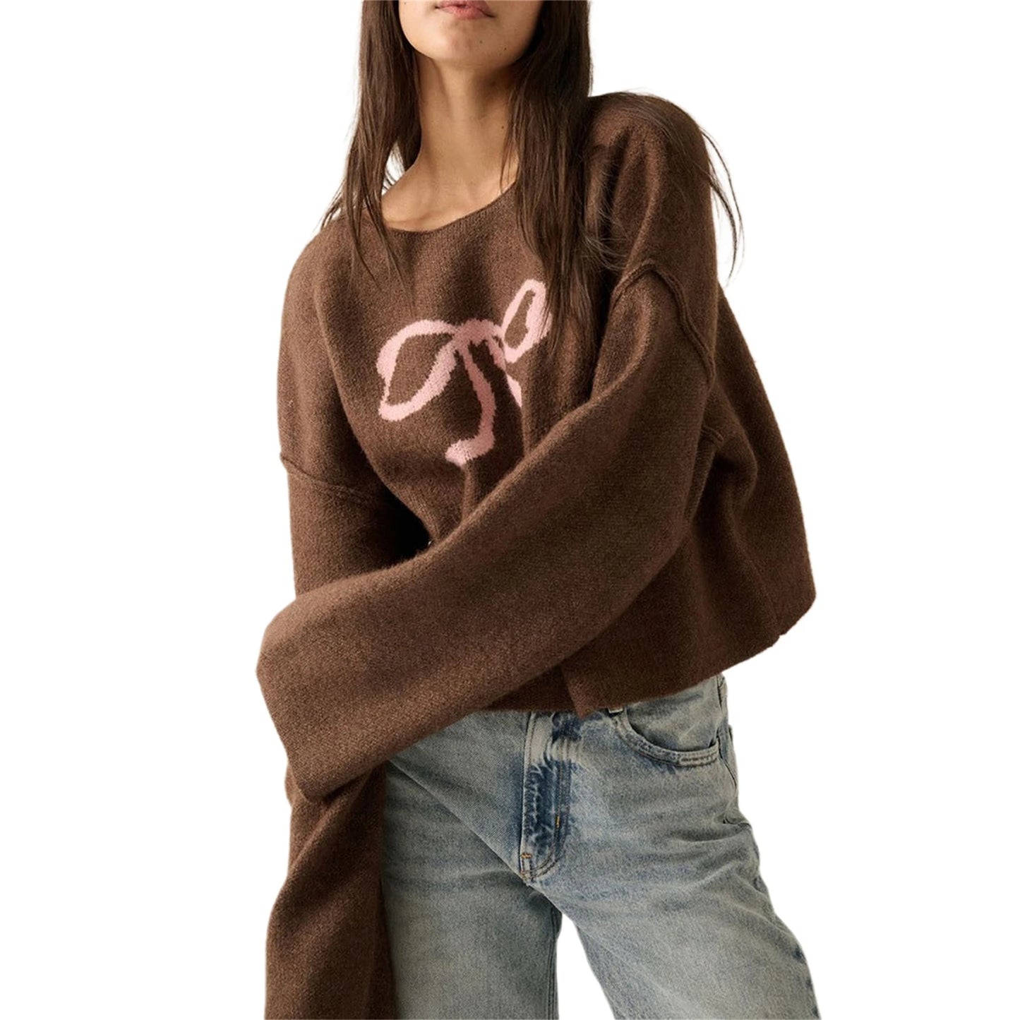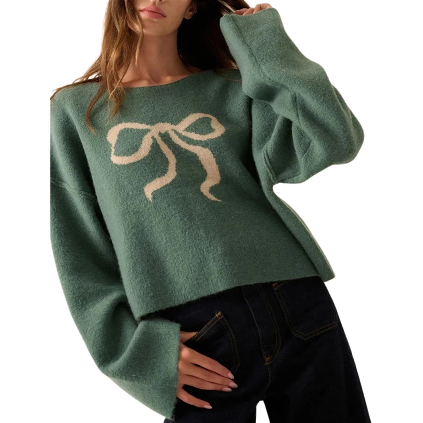Womens Bow Sweater Loose Crew Neck Wide Long Sleeve Pullover Knit Tops Casual Streetwear for Winter Fall