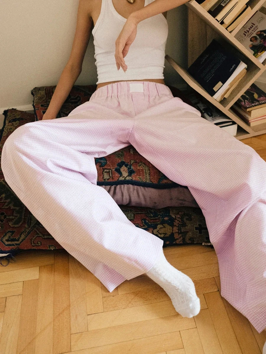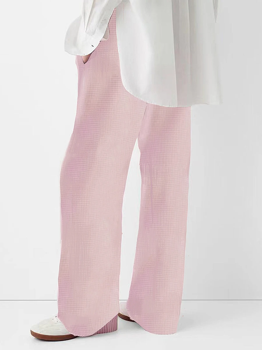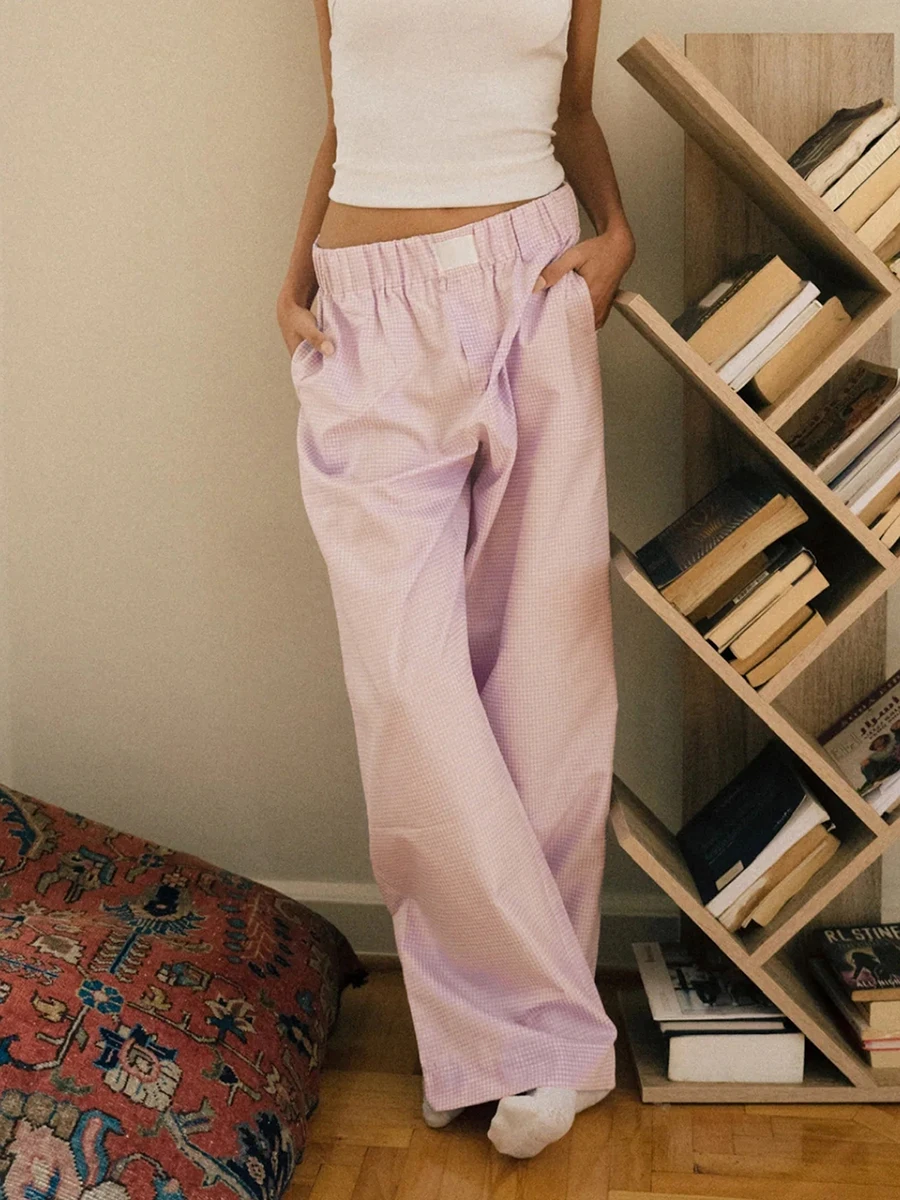 Women's Spring Summer Baggy Pants Elastic Waistband Loose Wide Leg Plaid Pants with 2 Pockets